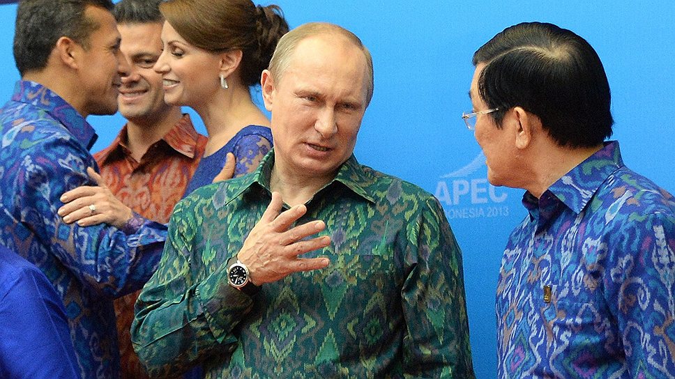 Апеллировать российский президент мог лишь к главам азиатских стран. Второй год подряд президент США Барак Обама не долетает до форума — на этот раз из-за бюджетного кризиса, парализовавшего американское правительство. В качестве компенсации в первый день форума Владимир Путин пообщался с председателем КНР Си Цзиньпином и премьер-министром Японии Синдзо Абэ. Китайский лидер подарил празднующему в Индонезии 61-й день рождения Владимиру Путину торт, японский — саке.