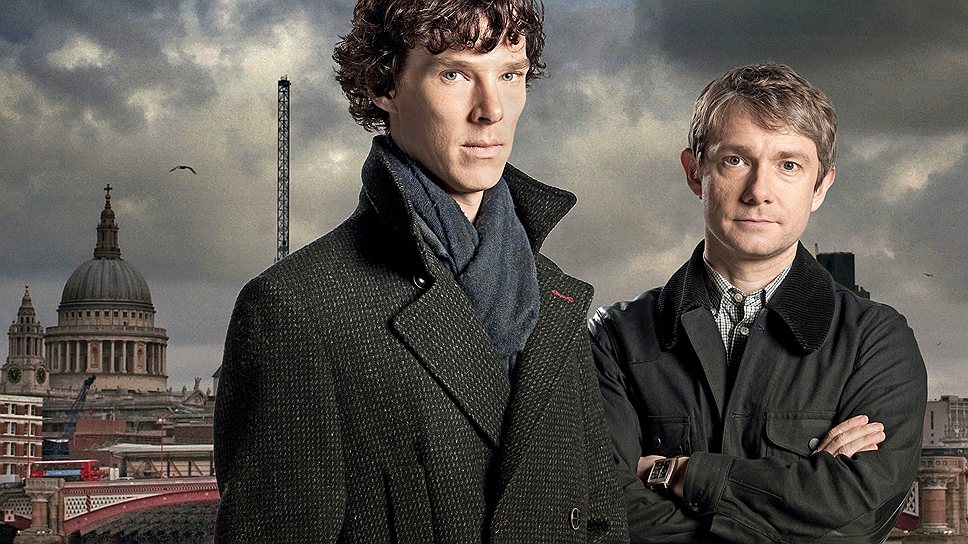 По замыслу это криминальная драма о современном Шерлоке Холмсе. Главные роли исполняют Мартин Фримен (Доктор Уотсон), и Бенедикт Камбербэтч (Шерлок Холмс). В 2012 году вышел второй сезон. В перерывах между съемками сезонов Фримен успел сняться в трилогии Питера Джексона «Хоббит», Камбербэтч же покорил подростков и фанатов ролью в «Стартрек: возмездие», а социально-ответственных зрителей — фильмом «Пятая власть», где сыграл Джулиана Ассанжа, кроме того, он отдал свою пластику и голос дракону Смогу.