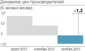 1,2 процента составило снижение цен промышленных производителей в октябре 2013 года по сравнению с сентябрем 2013 года, сообщил вчера Росстат. Отрицательную динамику в октябре показали все наблюдаемые отрасли промышленности при заметном лидерстве добывающих отраслей (минус 3,9% за октябрь), обеспеченном снижением цен на нефть и газ. В годовом выражении оптовые цены на конец октября увеличились на 2% (8,8% — на конец октября 2012 года). Лидером роста цен после планового увеличения регулируемых тарифов стала отрасль производства и распределения электроэнергии, газа и воды (7%), опередив добычу (2,9%). Рост цен в обработке на фоне падения спроса замедлился до 0,6%, провоцируя дальнейшее сжатие прибыли компаний и снижая их склонность к инвестированию.