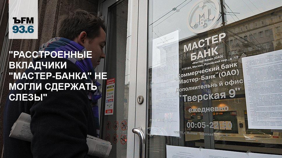 На ступеньках головного офиса "Мастер-банка" в Руновском переулке в среду утром собралось несколько расстроенных вкладчиков, некоторые не могли сдержать слезы. С 10 утра среды банкоматы "Мастер-банка" не работали, а очень скоро после известия об отзыве лицензии снять средства стало невозможно и в банкоматах других банков, сообщила одна из вкладчиц.