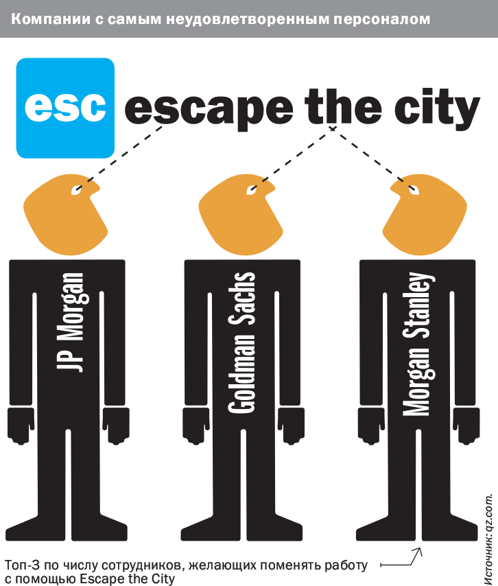 В 2009 году два преуспевающих сотрудника крупных компаний лондонского Сити, Роб Саймингтон и Доминик Джекман, задумались, как бы сменить не приносящую удовлетворения работу. Не найдя других подходящих вариантов, они скопили деньги и основали интернет-проект Escape the City, предлагающий альтернативную карьеру тысячам профессионалов, недовольных судьбой. В настоящее время сайт escapethecity.org имеет более 130 тыс. подписчиков. Вакансии, попадающие на сайт, должны отвечать специально установленным критериям, как то: возможность развивать предпринимательские навыки, приносить пользу обществу и отправиться в экзотическое место. К примеру, проект помог менеджеру хедж-фонда из Лондона стать управляющим гостиницы в Мозамбике. Еще два банкира из Сити отправились заведовать расчисткой минных полей в Камбоджу и руководить борьбой с трущобами в индийском Мумбае. Основную прибыль Escape the City приносят банк вакансий от более чем 8 тыс. компаний и мероприятия по налаживанию деловых контактов. В 2012 году основателям удалось за 14 дней собрать около Ј600 тыс. ($980 тыс.) на расширение бизнеса с помощью краудфандинга. Помимо Лондона проект работает в Нью-Йорке, где пользуется большой популярностью у молодых банкиров с Уолл-стрит. "Есть множество людей, которые успешно окончили университет и гордились тем, что получили работу в крупной фирме. Но через несколько лет постоянных переработок они понимают, что трудятся по большей части на босса и не используют свой потенциал на полную катушку",— говорит Роб Саймингтон. По его словам, времена, когда работой мечты для любого выпускника был банк Goldman Sachs, остались в прошлом.