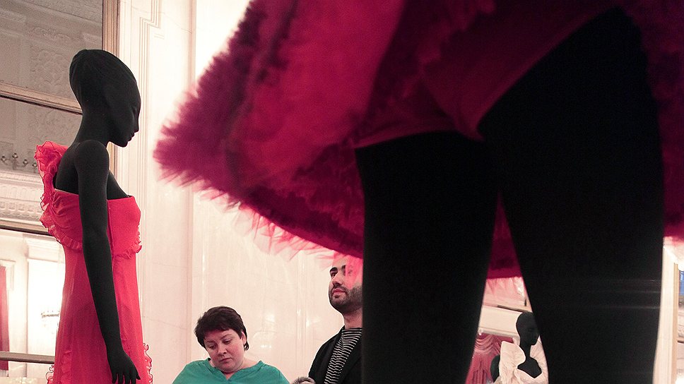 В чопорном классическом духе представлен на выставке дом Valentino: Валентино Гаравани, великий певец старосветского Рима, показывает в Шереметевском дворце свою пачку. Это эффектная пачка канонической балетной формы из шелковидного тюля любимого дизайнером красного цвета, а также лилового и розового цветов с рисунком "ромбы". Данное балетное платье, отсылающее к костюму Арлекина, было выполнено совсем недавно — для концертного номера "Не моя девушка" ("Нью-Йорк Сити Балле", 2012). Еще более образцовыми выглядят работы Роберто Капуччи, дизайнера, который много работал для примадонны бельканто Райны Кабаивански. Титанические, многодельные парадные платья, сложные и пышные, будто готический собор, демонстрируют искусство модной архитектуры. Оперные платья Роберто Капуччи — из цветного шелка, тафты, газа, шифона, с сотнями мелких плиссировок, с искусственными цветами, бантами, с безупречными складками — это честнейший канон искусства haute couture. И, наконец, знаменитая итальянская королева шифона Альберта Ферретти показывает дорогостоящие шифоновые вариации испанского народного стиля, а также версии столь любимого ею стиля ар-деко (костюмы к "Кармен", 2003).