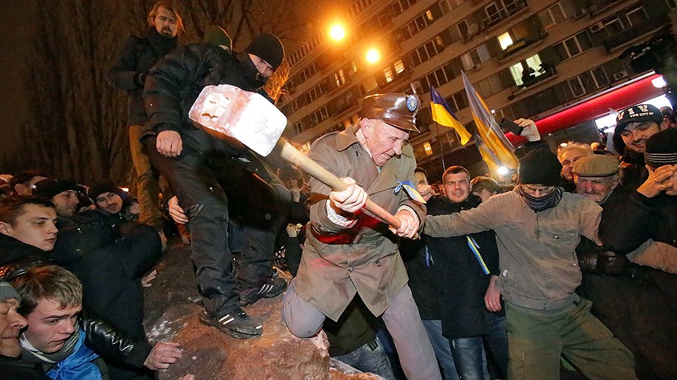 Впрочем, этим дело не ограничилось. Около 18.00 группа молодых людей тесным кольцом окружила памятник Ленину на бульваре Тараса Шевченко. Скандируя "Вместе и до конца!", активисты набросили на статую тросы и с помощью машины повалили ее на землю. Позже в интернете появилось видео, на котором участники акции разбивают остатки скульптуры кувалдами. На пустой постамент водрузили государственный флаг Украины и красно-черные флаги. Ответственность за случившееся взяла на себя партия "Свобода". "Я был во многих городах Украины. И в каждом из них меня просили убрать этого "болвана" из Киева",— объяснил журналистам народный депутат Игорь Мирошниченко ("Свобода").