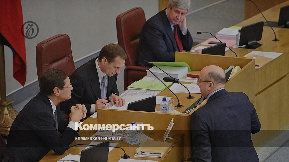 Первый заместитель председателя Государственной Думы (ГД) России Александр Жуков, председатель ГД России Сергей Нарышкин, первый заместитель председателя ГД России Иван Мельников и председатель комитета Госдумы России по конституционному законодательству и государственному строительству Владимир Плигин (справа) на пленарном заседании Госдумы России