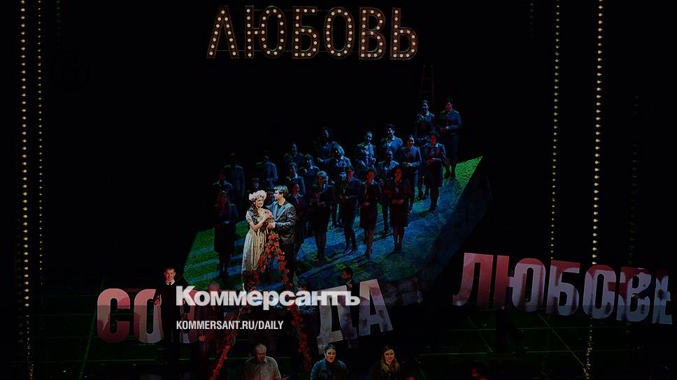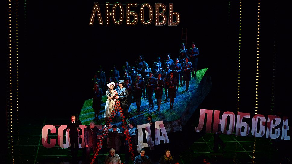 При вроде бы программной ставке на абстракцию и остранение (особенно по части визуального ряда) спектакль никогда не выглядит зубоскальством, в крайнем случае — иронией, да и то такой, которая по отношению к героям всерьез сочувственна. В жизни так бывает у стеснительных людей, на всякий случай делающих легкомысленную мину именно в тот момент, когда они пытаются проговорить что-то важное и патетическое. Допустим, когда Лыков уже было собирается справлять помолвку с Марфой, и мнимо счастливая чета забирается на увитую цветами стремянку, и на сцене тоже полыхают видеоцветы, и на Лыкова надевают пиджак, украшенный светящимися лампочками, и над сценой загорается слово "любовь" в обрамлении все тех же лампочек, то от всего этого болливудского сияния становится совсем уж непереносимо жалко этих двоих, которые до поры играют в свое чудесное детское счастье, но на самом деле обречены. Вот ей-ей, не было бы жальче, если бы герои разыгрывали патриархальную любовную мизансцену костюмного толка.