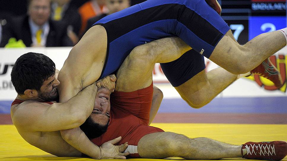 В финальной схватке турнира вольников в весовой категории до 86 кг россиянин Абдулрашид Садулаев (сверху) взял верх над белорусом Мурадом Гайдаровым (снизу)