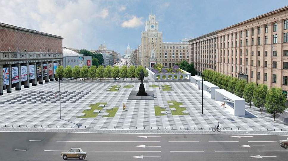 О победе BuroMoscow в конкурсе вчера объявил главный архитектор города Сергей Кузнецов. По его словам, число парковочных мест на Триумфальной площади будет сокращено, автомобильный поворот с Садового кольца на 1-ю Брестскую улицу сохранится. В эскизах к проекту BuroMoscow предлагает выровнять площадь, замостив почти все пространство от концертного зала до здания Минэкономразвития серым треугольным гранитом (несколько газонов оставят у памятника Маяковскому). У концертного зала предлагается оборудовать восемь рядов сидений, а у здания напротив — выстроить три каменных портала, внутри которых разместить качели. У гостиницы "Пекин" предполагается разбить сквер с кустами сирени, заключив его в прямоугольную колоннаду. От 1-й Брестской улицы часть площади отгораживает небольшое озеро с "растущими" в нем липами. "Это образ молодости, свободы и романтики",— поясняла ранее смысл проект гендиректор BuroMoscow Ольга Алексакова.