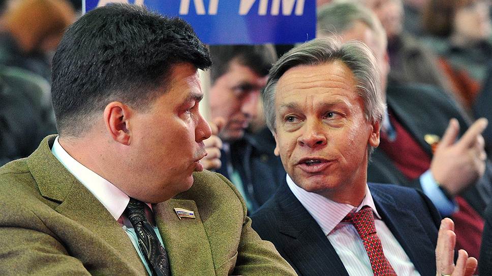 Российскую делегацию в ПАСЕ (справа — ее глава Алексей Пушков) лишили права голоса за воссоединение Крыма с Россией