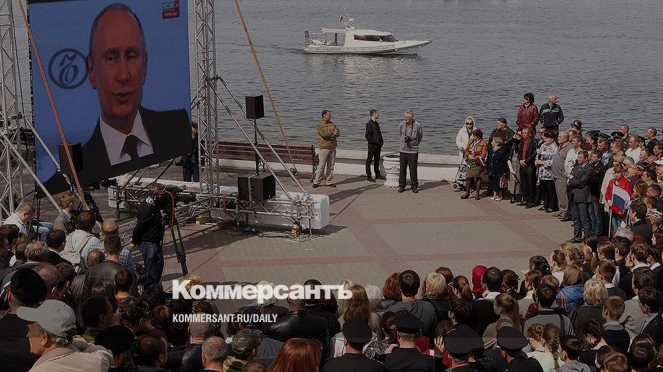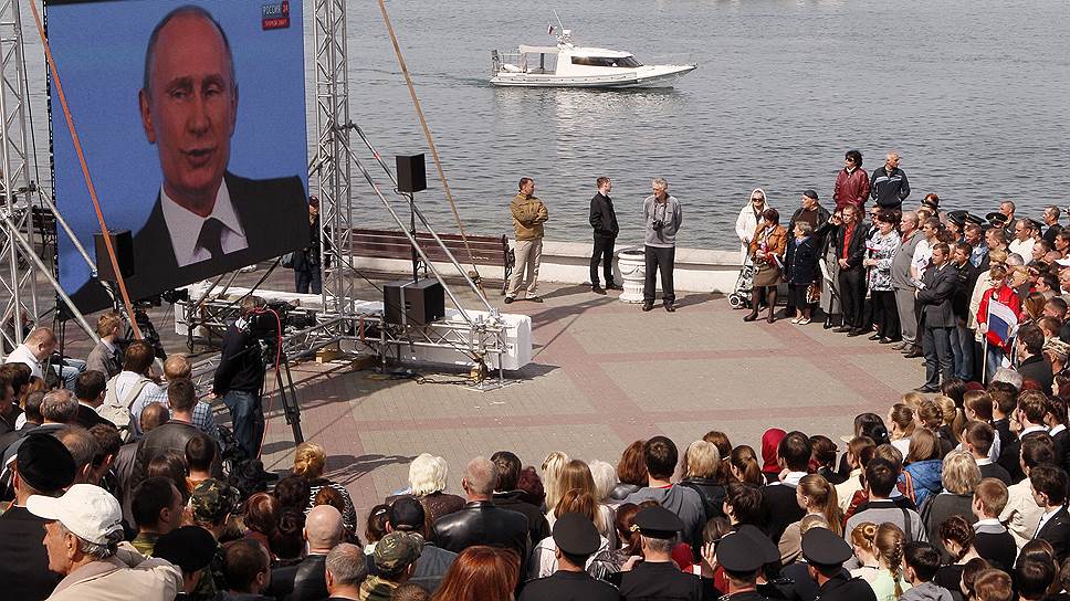 — И когда стало ясно, что явка составила 83%, что 96 с лишним процентов высказались за присоединение к Российской Федерации, стало очевидно, что это абсолютное, просто практически полное большинство, если не сказать все крымское население. В этих условиях поступить иначе мы не могли,— заключил Владимир Путин.