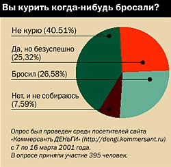 Однако даже такими страшилками заядлого курильщика не отучить от вредной привычки. По последним данным, приведенным директором НИЦ профилактической медицины Минздрава РФ академиком Рафаэлем Огановым, в России курят 63,2% мужчин и 9,7% женщин. При этом курение — именно болезнь со всеми ее атрибутами — врачами, лекарствами, методиками лечения. Сегодня в крупных городах России рынок медицинских услуг для желающих бросить курить вполне сложился (ведь только одна Москва выкуривает за год примерно 15 млрд сигарет). Однако рынок этот хаотичен и, по сути, не регламентирован. Тому есть как минимум две причины.