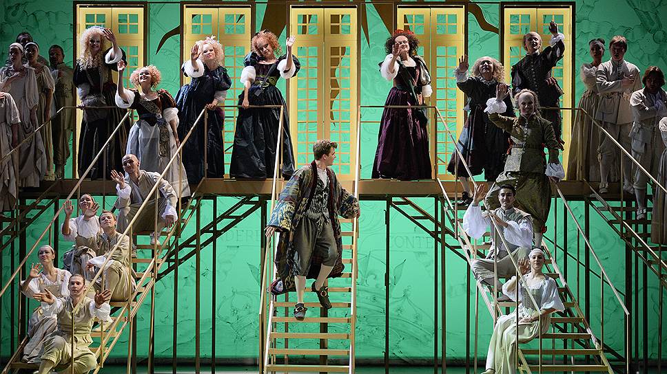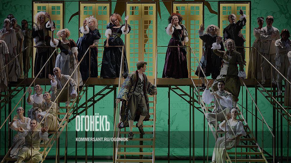 Короля в опере ждут на протяжении всего действия, в этом и интрига, позаимствованная из "Версальского экспромта": кошмар, его величество будет уже через полтора часа, а у нас еще пьеса не выучена. И вдобавок актеры устраивают обструкцию режиссеру-Мольеру (Дмитрий Орлов). А потом из-под палки как бы репетируют как бы фрагменты из пресловутой пьесы, которыми и оказываются мало связанные что стилистически, что логически отрывки, перечисленные выше. На эффектное оперное либретто это похоже не больше, чем сценарии "капустных" театральных вечеров или премиальных церемоний.
