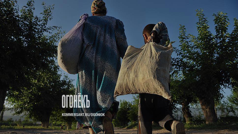 Мария и Эмомали, невестка и внук Пардахол, несут домой листья тутовника