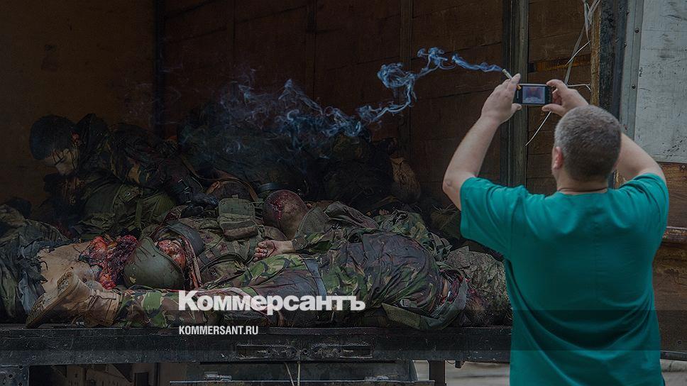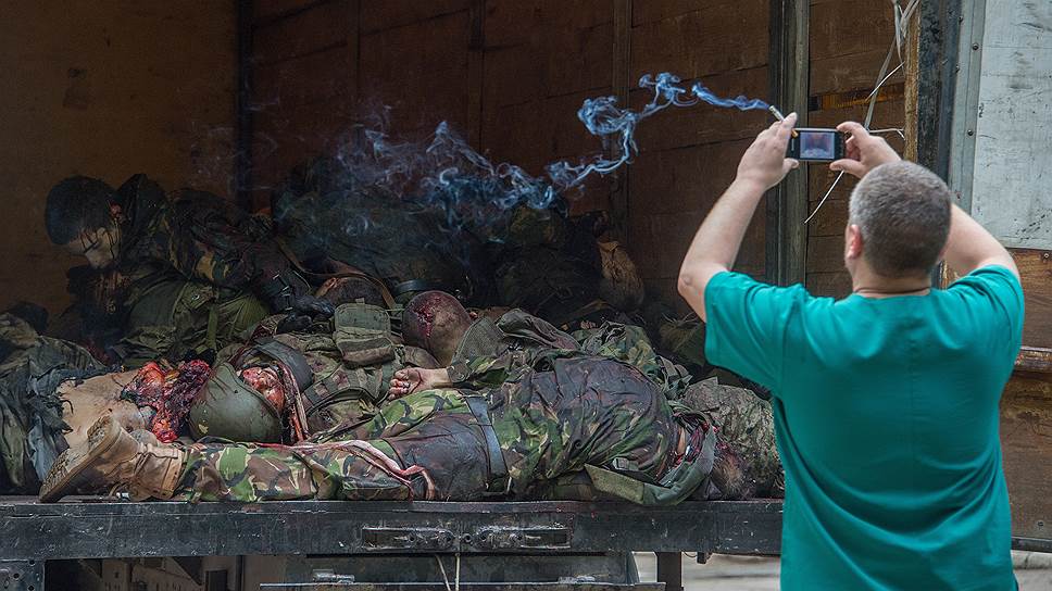 27 мая. Тела погибших ополченцев батальона «Восток» у морга Калининской больницы Донецка