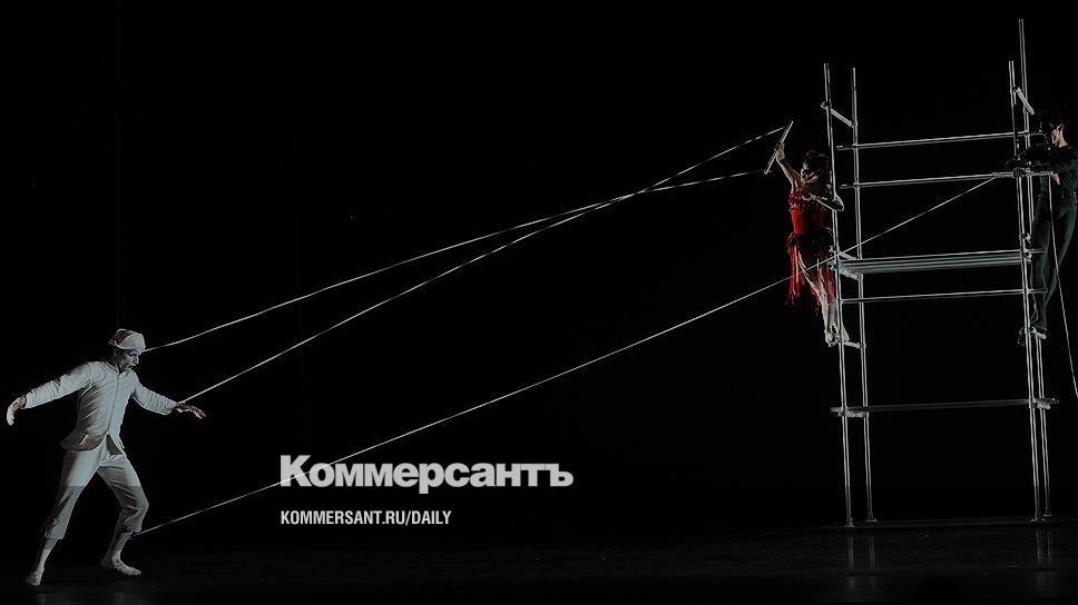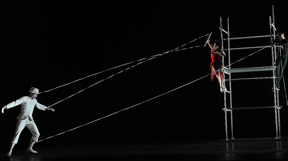 Чтобы понять, как далеко хореограф Тетли отошел от поэзии оригинала, достаточно сказать, что "прачка бледная, луна", которая "обмывает ночью землю", обернулась прачкой Коломбиной, протягивающей над сценой веревку с развешанными на ней подштанниками и полотенцами. Но снижение текста отнюдь не сделало примитивным сам балет, основанный на каноническом любовном треугольнике из вольно интерпретированной комедии дель арте. Поэт Пьеро, обитающий в башне из слоновой кости, принявшей вид металлической конструкции вроде строительных лесов, влюблен в бессердечную, вульгарную, но неотразимо сексапильную Коломбину. Та с наслаждением дурачит его, то отвешивая пощечину за одно прикосновение к груди, то вовлекая в разнузданную случку. Воплощенное женское коварство, она в одной связке с воплощением коварства мужского — длинным, циничным и мрачным шутом Бригеллой, обретающим над доверчивым Пьеро почти демоническую власть. Сцена, в которой разудалые манипуляторы дергают марионетку Пьеро за веревки (считай — за нити его чувств),— одна из самых впечатляющих в этом спектакле, где сложнейшая техника смешанного танца заслонена актерскими задачами исполнителей.