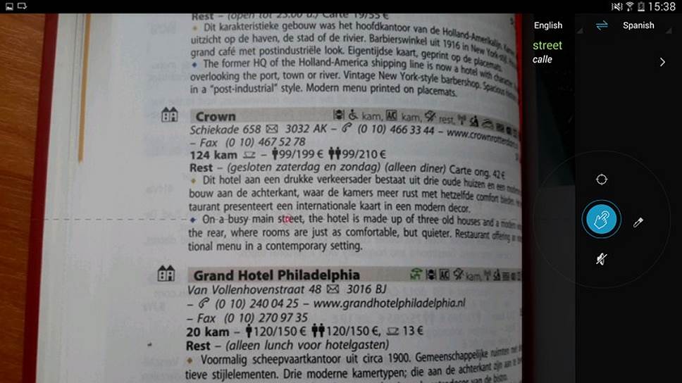 Новая версия популярного словаря по-прежнему исправно переводит слова на нескольких десятках языков, не требуя доступа в Интернет. Что является новинкой, так это перевод с фотографий. Наводим камеру на непонятное слово, тычем в кнопку «Перевод» пальцем — наслаждаемся. Работает система быстро, правда, распознает слова не слишком надежно. Это, справедливости ради, касается и всех известных нам аналогов.