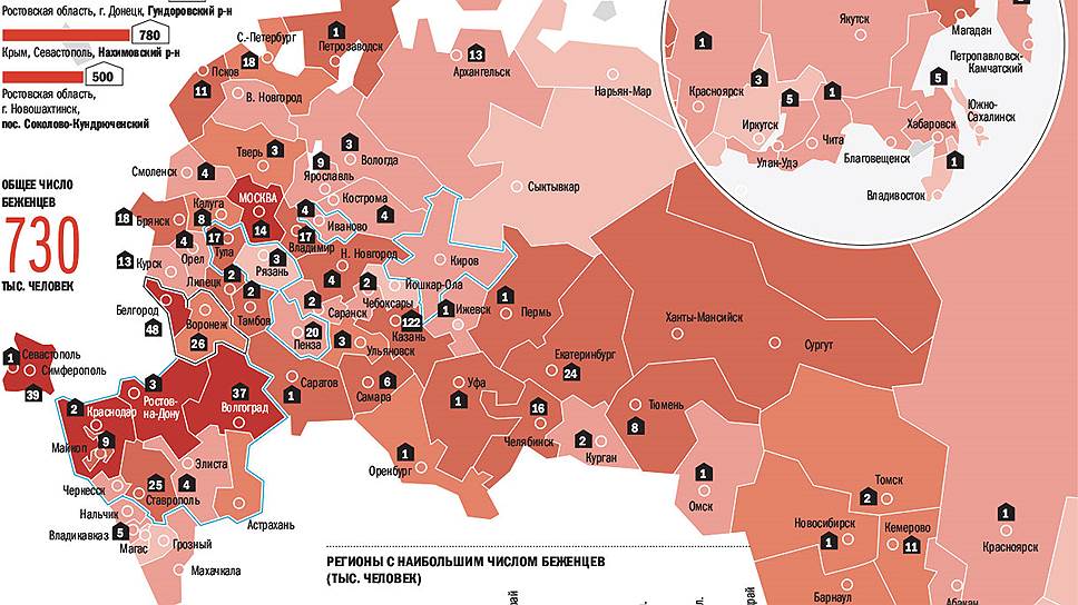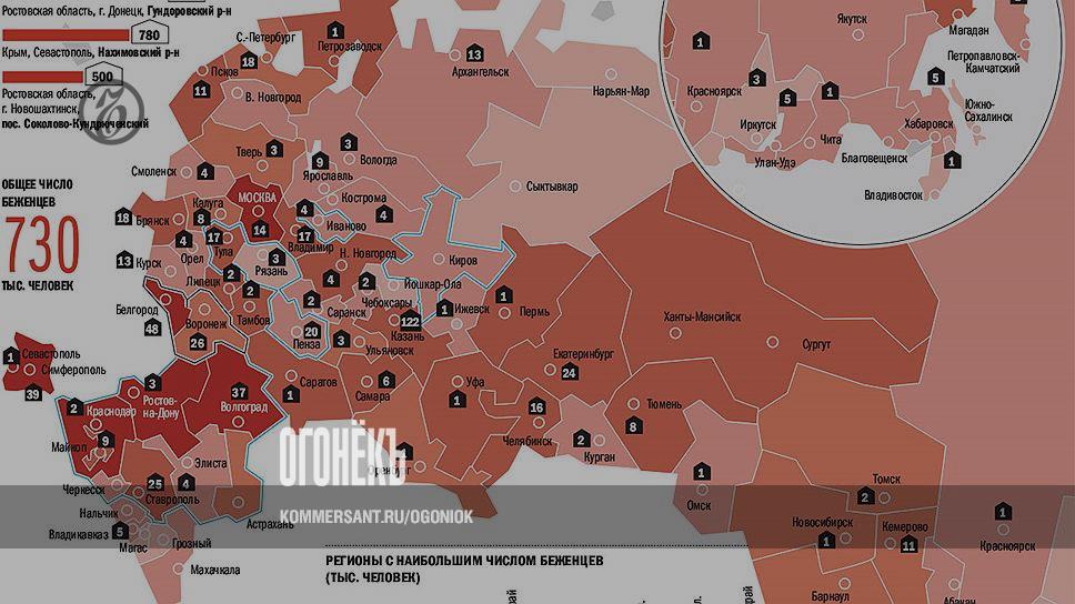 Официальные данные такие: 78 тысяч обратились в Миграционную службу с ходатайством о признании беженцем и за получением временного убежища. Абсолютное большинство прибывших в Россию находится в подвешенном юридическом состоянии, многие рассчитывают со временем вернуться на Украину. Для хоть какого-то упорядочения правительство объявило о решении переселить 11 291 гражданина Украины в 37 российских регионов, участвующих в программе добровольного переселения соотечественников. Наибольшее число людей готовятся принять Тульская, Калужская и Оренбургская области, но программа предусматривает переселение и в такие удаленные регионы, как Магаданская и Сахалинская области.