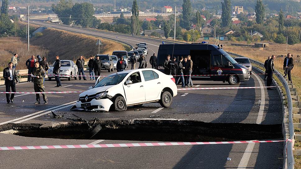 Как сообщил «Интерфаксу» источник в мэрии Симферополя, крупное ДТП произошло в результате поломки арки над железнодорожным тоннелем, который проходит под дорогой. «Очевидных причин может быть две: либо это дожди, либо ошибка в проектировании»,— заявил собеседник агентства.