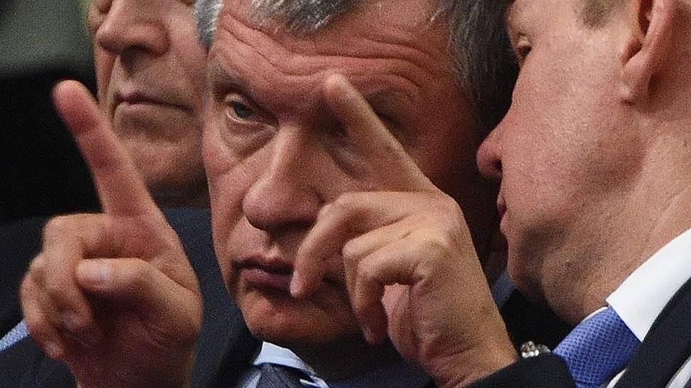 Ответ на санкции, предложенный главой «Роснефти» Игорем Сечиным (в центре), ставит под вопрос экспортную монополию «Газпрома»