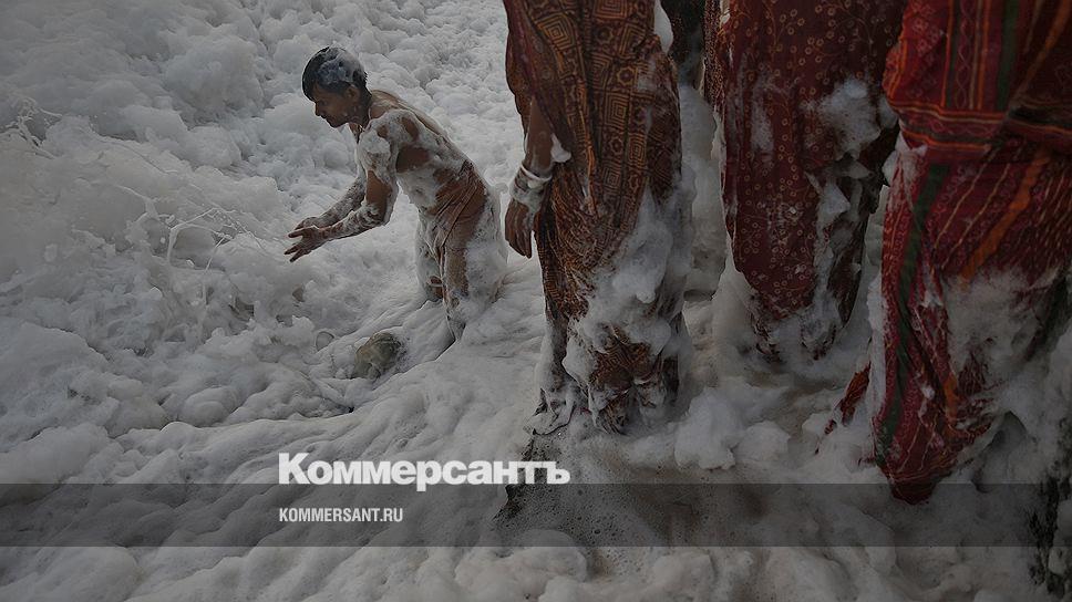 Индуисты во время обряда поклонения богу Солнца Сурье в загрязненных водах реки Джамна в Нью-Дели