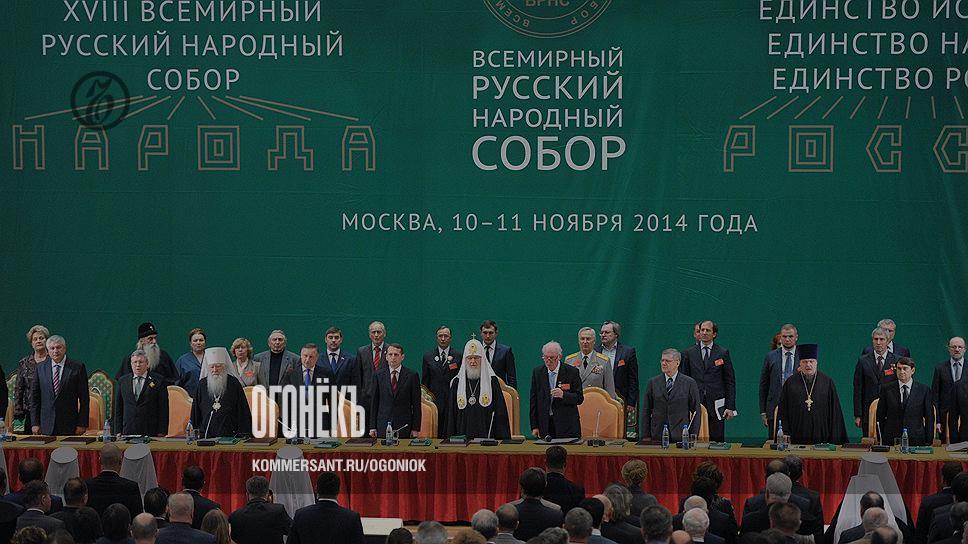 Участники XVIII Всемирного русского народного собора (ВРНС) готовились принять особый документ, который должен был ответить на непростой вопрос, кто же такой русский человек. Например, в Германии, чтобы называться немцем, нужно обязательно иметь немецкую кровь (от отца или матери), а в США американцем может быть всякий, кто признает Конституцию государства. Такого однозначного понятия о русской идентичности у нас пока нет. В ожидании ответа фойе Зала церковных соборов храма Христа Спасителя заполнили десятки делегатов со всей страны: учителя и политики, военные и футбольные болельщики, писатели и артисты, ученые, космонавты и кулинары-патриоты. Народу собралось так много, что возникло волнение: хватит ли номерков в гардеробе? Но в итоге обошлось, зал не заполнился до конца, так что все могли спокойно занять места и приготовиться к открытию Собора, тема которого была обозначена так: "Единство истории, единство народа, единство России".