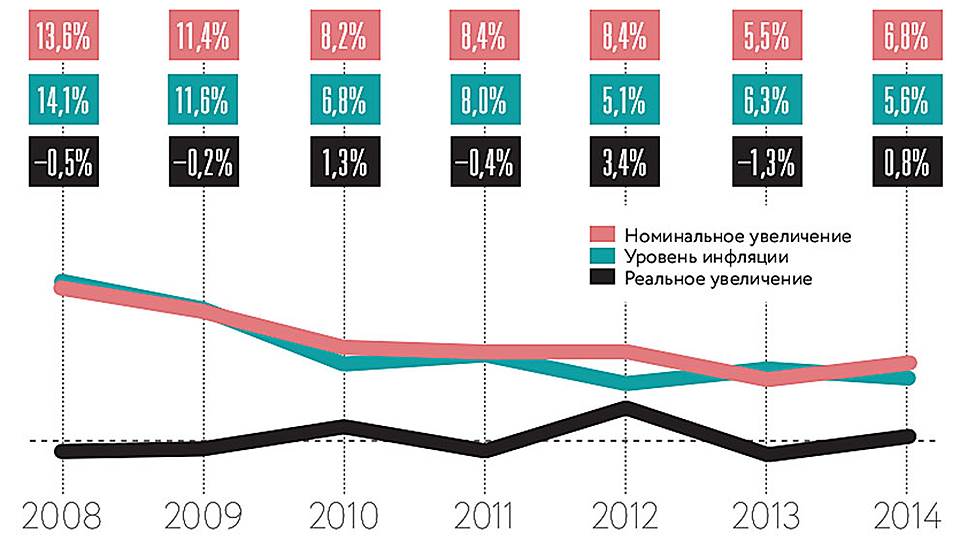 Ситуация на рынке труда последние три года ухудшалась. Компания EY регулярно составляет общеиндустриальные обзоры заработных плат и компенсаций, интересуется планами работодателей по увеличению зарплат на ближайшие 12 месяцев. Если в 2012 году компании планировали увеличить размер заработной платы в среднем на 9%, то в 2013-м — на 8%, а в начале 2014 года речь шла уже о 7%. Но благие намерения работодателей зачастую остаются на бумаге. "Бывает, что по опросам ритейлеры собираются увеличить зарплаты. Через полгода выходит новое исследование, и выясняется, что 23% опрошенных отказались от этой идеи вовсе, еще 20% отложили вопрос на потом",— рассказывает директор по персоналу Inventive Retail Group Татьяна Гладюк.