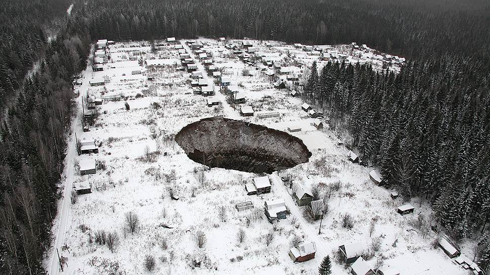 Первые видимые последствия аварии обнаружились еще 18 ноября — обрушение грунта в 3,5 км восточнее СКРУ-2. До ближайших многоэтажных жилых домов на улице Металлургов до провала около 1,9 км, от крупных жилых массивов (микрорайон Красное) — около 6 км. По данным МЧС, размер воронки — 20 м на 30 м (по другим данным — 30 м на 40 м). Зона обрушения оцеплена. По словам местных жителей, провал произошел в садовом товариществе "Ключики", под землю ушло три дома. "Сады после 1995 года не эксплуатируются, так что проблем нет. А если у кого-то есть вопросы с собственностью, то "Уралкалий" будет их решать",— пояснил "Ъ" глава правительства Пермского края Геннадий Тушнолобов. Мэр Соликамска Сергей Девятков еще более оптимистичен: "Большая часть дачников разбежалась давно, когда воронка наполнится, она превратится в озеро, и это будет просто отличное место для отдыха",— считает чиновник. Владельцы дач в поселке Ключики признают, что он считается заброшенным, но хозяева летом приезжали туда отдыхать и "сажать картошку".