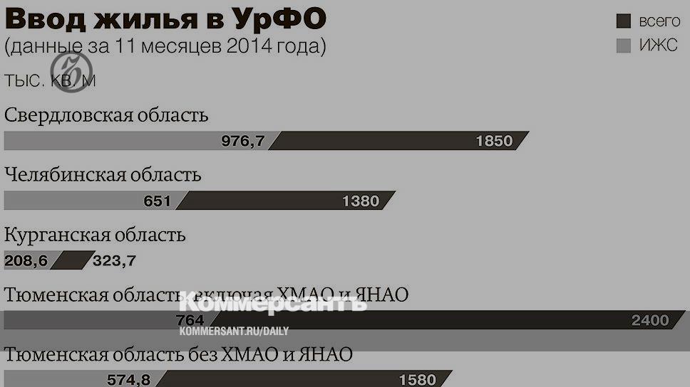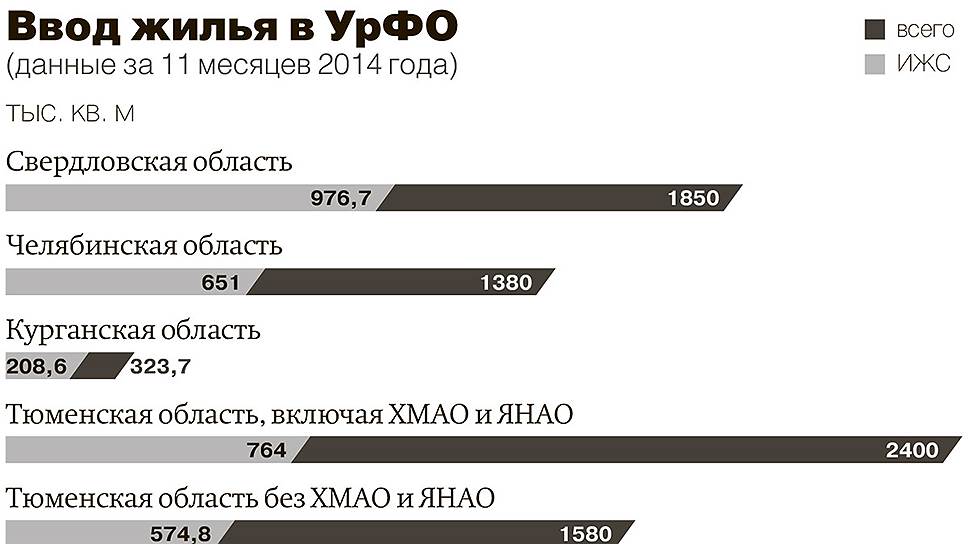 За 11 месяцев 2014 года в Уральском федеральном округе, по данным Росстата, лидерами во вводу жилья стали Тюменская область с автономными округами (2,4 млн кв. метров жилья, что на 22% больше показателя 2013 года, из них 764 тыс. кв. метров — ИЖС, если считать без учета ХМАО и Ямала; объемы ввода в регионе— 1,58 млн кв. метров, что на 22,3% больше показателя 2013 года, 574,8 тыс. кв. метров — ИЖС) и Свердловская область (1,85 млн кв. метров, что в 1,8 раза больше, чем за аналогичный период 2013 года, из них 976,7 тыс. кв. метров — доля ИЖС), следом идет Челябинская область (1,38 млн кв. метров, ИЖС — 651 тыс. кв. метров, что на 7,7% больше, чем в 2013 году), в аутсайдерах — Курганская область (323,7 тыс. кв. метров, что на 47,5% больше, чем в 2013 году, доля ИЖС —208,6 тыс. кв. метров).