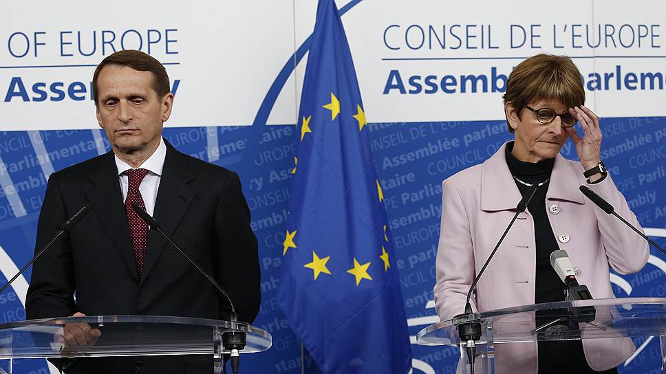 Спикер Госдумы РФ Сергей Нарышкин и председатель ПАСЕ Анн Брассер во время заявления для прессы в здании Парламентской ассамблеи Совета Европы