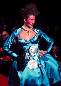 На дефиле на Казанском вокзале Вивьен явилась в очень короткой клетчатой юбке, с очень пышными кудряшками цвета апельсина, в стильных туфлях на шнуровке с раздвоенными носами и в теплых шотландских колготках с начесом. "I`m so hungry",— обращалась Вествуд к манекенщицам, готовящимся к выходу на подиум. Но в суете показа на нее никто не обращал внимания. Оглядевшись, она заметила сверток из "Макдональдса" — кто-то оставил недоеденный и уже остывший гамбургер. Вивьен подняла его и отщипнула кусочек. Тут же у ее рта оказался микрофон радиожурналистки. "Не видите, я занята",— ничуть не растерявшись, Вествуд отстранила микрофон и демонстративно отошла, прихватив с собой сверток.