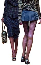 В последний день визита после ужина в "Кумире" и пяти длинных интервью Вествуд отправилась делать "клаббинг". В клубе "Буги-Вуги" она первым делом спряталась в VIP-зале и съела три апельсина. В "Экипаже" (здесь дизайнер появилась вместе с Андреем Бартеневым) она ничего не ела, зато выпила сразу два коктейля. В два часа ночи Вивьен уже была в "Реставрации", где ее немедленно атаковал известный столичный трансвестит Огненная Леди со словами: "Давай меняться колготками". При этом на Вествуд были ажурные коричнево-зеленые колготки из ее последней коллекции, а на Огненной Леди — рваные чулки с поясом. "Меняться не стану, в твоих мне будет холодно",— мудро рассудила Вествуд, однако пообещала оставить колготки в подарок трансвеститу утром на reseption. И действительно оставила их, прикрепив к свертку записку: "Рвать запрещаю".