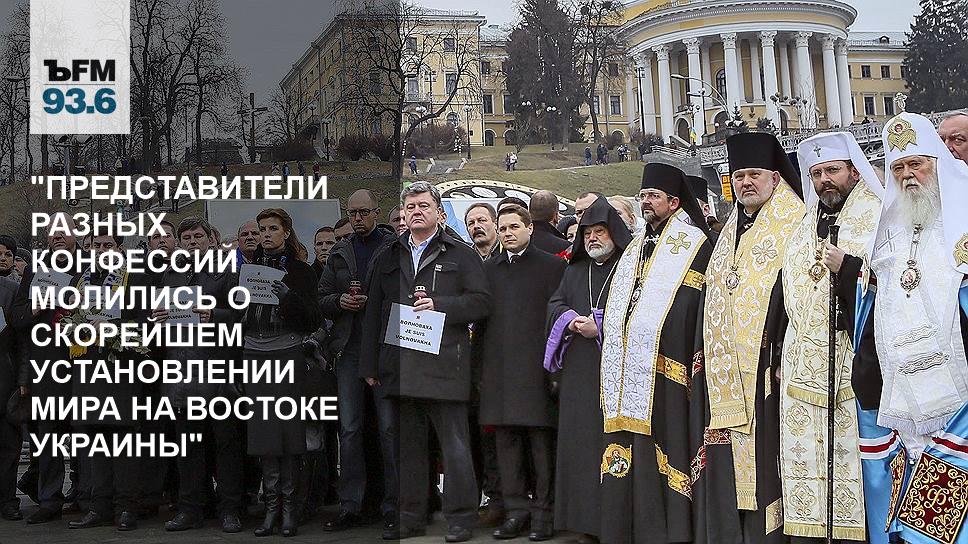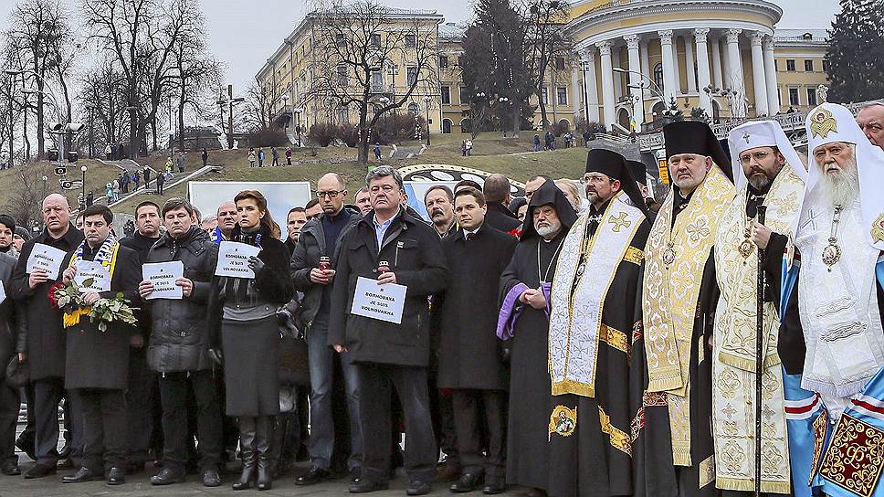 В воскресенье в Киеве состоялось сразу две акции, причем, первоначально планировалось, что обе они будут называться "Я Волноваха". По аналогии с лозунгом французских демонстрантов, вышедших на улицы городов с плакатами "Я Charlie" после расстрела террористами сотрудников редакции сатирического еженедельника. Но в последний момент устроители второй акции решили избежать путаницы и сменить название на "Я Украина". Объяснения, почему понадобилось организовывать сразу две акции, довольно туманны. Организаторы второй — той самой, что в итоге стала называться "Я Украина" — заявляли, что, дескать, первую акцию используют для своей раскрутки политики и указывали на то, что, например, секретариат "Блока Петра Порошенко" активно распространял призыв к украинцам, да и гражданам других государств, выйти 18 января на улицы и почтить память погибших в Донбассе. При этом организаторы альтернативного марша в своих воззваниях приглашали президента и других первых лиц присоединиться к ним. Но Порошенко пришел на другой марш, вернее, на завершавший его молебен. С лампадкой и листом бумаги "Я Волноваха" в руках, президент стоял на сцене Майдана Незалежности в компании с Арсением Яценюком и активистами революции годичной давности, пока глава Украинской православной церкви киевского патриархата Филарет объяснял многотысячной толпе, что даже в кровавой войне можно найти промысел божий.