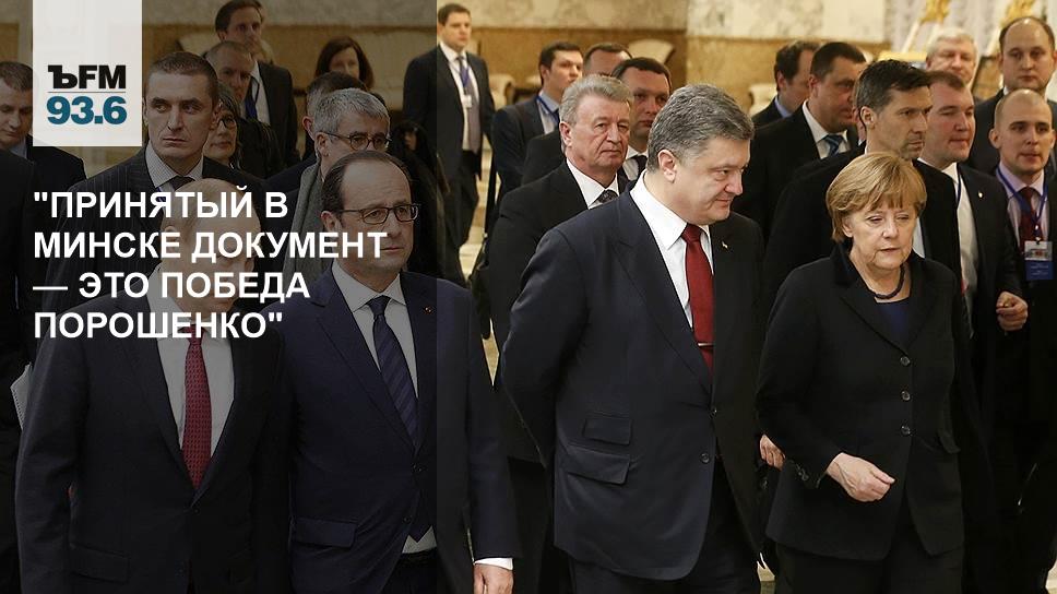 Прежде всего, я считаю это победой президента Порошенко, потому что если посмотреть этот документ, а вы сейчас его цитировали, то ДНР и ЛНР признают себя частью Украины, до конца года должны быть проведены выборы по украинским законам, до конца года должна быть восстановлена украинская пограничная линия, пограничный контроль на границе Украины с Россией.