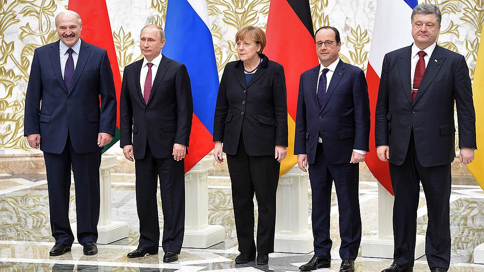 Саммит "в нормандском формате" по урегулированию кризиса на Украине. Президент Белоруссии Александр Лукашенко, президент России Владимир Путин, федеральный канцлер Германии Ангела Меркель, президент Франции Франсуа Оланд и президент Украины Петр Порошенко