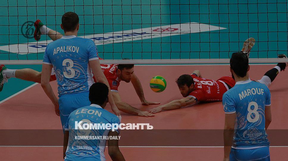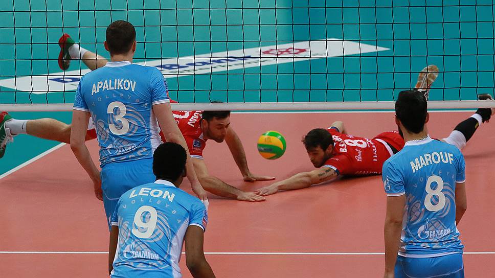 Волейболисты «Зенита» (в голубой форме) в первом матче с «Халкбанком» не испытали никаких трудностей