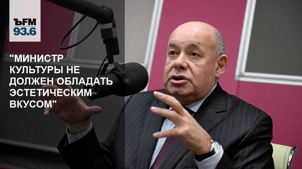 Михаил Швыдкой о своей работе министром культуры России: "Передо мной стояли несколько иные задачи, чем перед людьми, которые пришли позже меня. Нам надо было выживать, заниматься экономикой культуры в большей степени, чем какими-то идеологическими лозунгами. Я считаю, что министр культуры не должен обладать эстетическим вкусом, у него не должно быть идеологии, как это ни парадоксально. Если ты хочешь быть министром культуры, на это время забудь о своей партийной принадлежности, вкусах, даже о том, что ты своим детям дома рассказываешь. Министр культуры — это человек, который создает среду, он должен быть равноудален от всех".