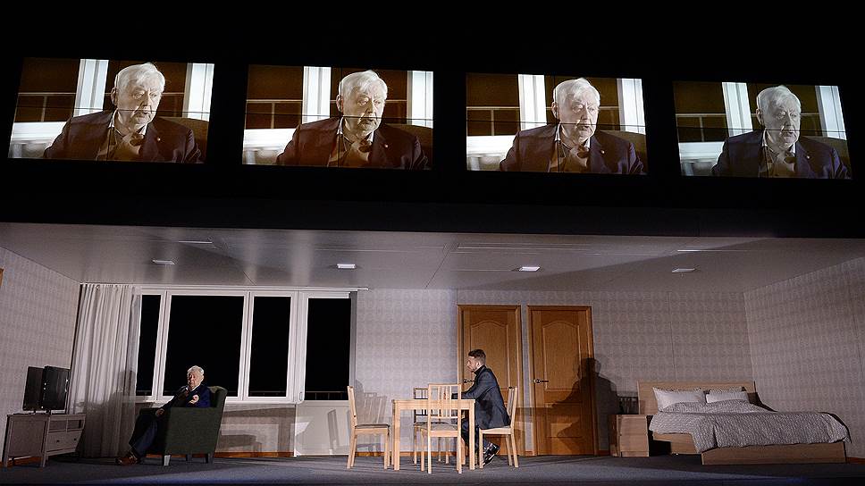 Впрочем, Константин Богомолов ставит спектакль вовсе не про умирание человека и не про спокойное приятие неизбежного. Он, хочется сказать, исследует саму смерть, которая для него равнозначна вакууму. Поэтому он выкачивал из актеров эмоции точно воздух из вакуумной колбы. Поэтому и декорация Ларисы Ломакиной кажется намеренно безвоздушной: вытянутая во всю ширину сцены, словно приплюснутая комната, лишенная примет быта и похожая на номер в дешевом отеле, сама по себе безжизненна. Она помещена в пустоту, и за окнами видна чернота сценической коробки. Персонажи к тому же постоянно находятся под прицелом видеокамер, стоящих по углам сцены и в партере. Их настройкой заняты бесшумные мужчины в черном — они чередуют общие и крупные планы, возникающие на экранах.