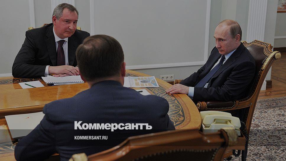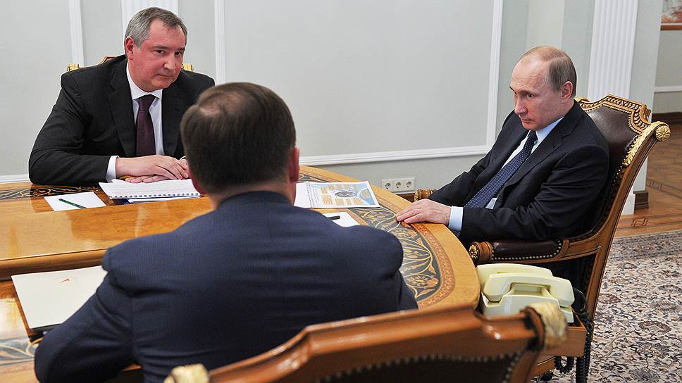 Президент России Владимир Путин (справа), глава объединенной ракетно-космической корпорации (Роскосмоса) Игорь Комаров (слева на первом плане) и вице-премьер РФ Дмитрий Рогозин (слева на втором плане)