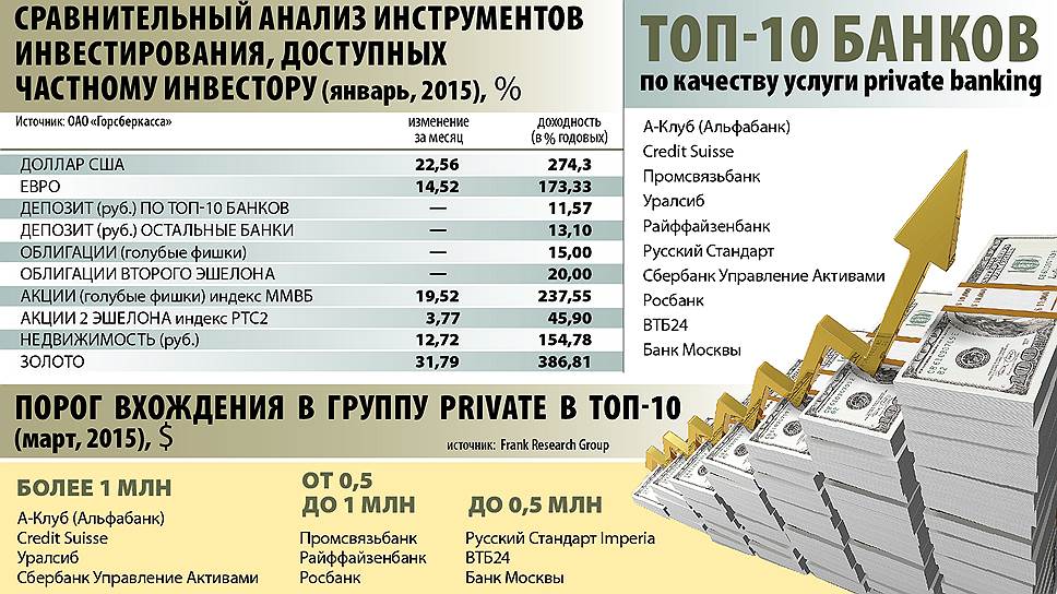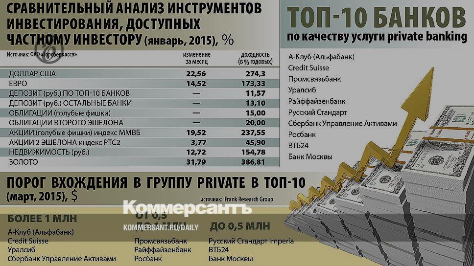 Инвестиционные продукты, которые банки предлагают элитным клиентам,— это, как правило, доверительное управление, составление инвестиционного портфеля, работа в системе интернет-трейдинга, совершение индивидуальных сделок с крупными пакетами ценных бумаг, предоставление структурированных продуктов и т. п.