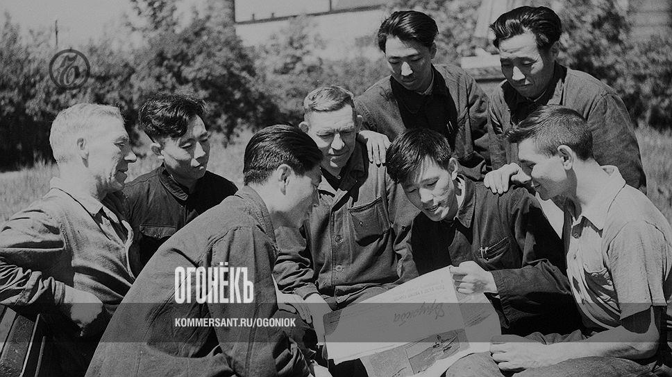 Классика постановочной фотографии. Советские рабочие и китайские практиканты на трубном заводе Первоуральска в перерыве читают в газете официальное письмо коллектива завода цельнотянутых труб Аньшаньского металлургического комбината. Газета называлась "Дружба", она специально издавалась в Китае на русском языке, и письмо тоже было о дружбе, которая "крепче железа".