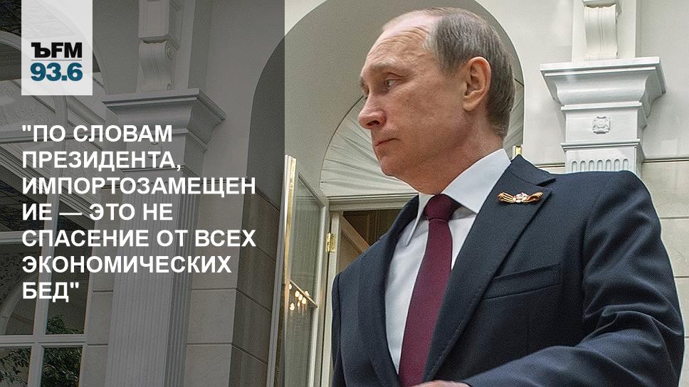 Кроме того, действительно коснулись вопросов импортозамещения. По словам президента, все замещать, абсолютно все, глупо и бессмысленно, и импортозамещение — это не панацея и не спасение от всех экономических бед. По мнению господина Путина, замещать импорт нужно там, где можно возродить собственные компетенции либо создать эти компетенции заново. Кроме того, президент заявил о том, что не нужно отгораживаться от других стран, а дать толчок собственному развитию и при этом не исключать заимствование технологий. В частности, господин президент привел в пример Китай, который достаточно динамично развивается после того, как заимствовал многие технологии из других стран. Также президент подчеркнул, что исключать иностранцев из системы госзакупок для того, чтобы открыть путь туда российскому малому и среднему бизнесу, нельзя, поскольку рынок лишится конкуренции, и компании с госучастием тоже не нужно из этого списка исключать, однако нужно сделать так, чтобы они не доминировали над малым и средним бизнесом.