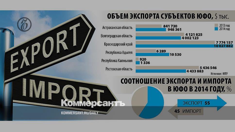 «В последние годы Ростовская область демонстрирует устойчивый рост экспорта. В прошлом году его доля превысила импорт и составила 55% во внешнеторговом обороте области»,— констатирует заместитель губернатора Ростовской области Михаил Чернышев. В Краснодарском крае, по данным Краснодарстата, экспорт составил почти 67% внешнеторгового оборота. Объем экспорта составляет более 50% от внешней торговли Астраханской области.