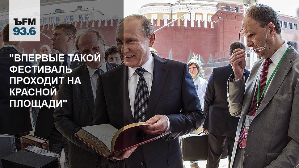 — Так вот и здесь, в общем, примерно происходит то же самое, просто все это раздвинуто — Красная площадь довольна большая, поэтому все это по площади раздвинуто, нет тех толп, которые, скажем, бывают в Центральном доме художника или на ВДНХ во время книжных ярмарок, когда просто как бы так люди роятся, толпятся. Здесь нет, здесь так довольно свободно все ходят, чуть в стороне, вот за нашей спиной расположены такие места "рефрешинг", я не знаю, как сказал бы Константин Эггерт, наверное, ну, в смысле там, где продаются прохладительные напитки, и еда здесь есть, так что в этом смысле все оборудовано для того, чтобы провести весь день. В общем, я-то ладно, мы здесь не скучали, мы работали, но вот, в принципе, я смотрю, люди ходят здесь практически в течение целого дня. Время от времени на главной сцене на фоне Василия Блаженного происходят некие события, например, Эдвард Радзинский читал свою лекцию по истории — это было еще утро, а сейчас, только что театр "Практика", Эдуард Бояков и Алиса Гребенщикова такую композицию устраивали, поэтически-музыкальную композицию, ну, на тему Великой Отечественной войны, естественно, сейчас, в этом году это такая главная тема, она вполне понятна.