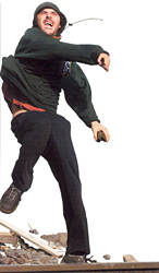 В пятницу утром, когда стали приезжать президенты, антиглобалисты предприняли атаку на "красную зону". Я пошел туда утром. И даже тогда еще было похоже на игру или праздник. Демонстранты бросали в полицейских пластиковые бутылки, а полицейские поливали антиглобалистов из водометов, и антиглобалисты в струях водометов купались.
