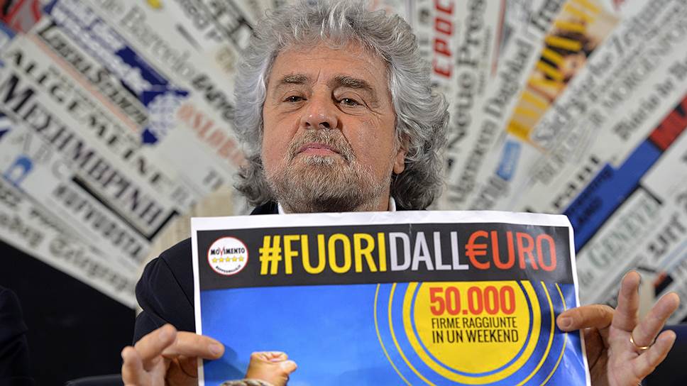 Лидер "Движения 5 звезд" Беппе Грилло держит плакат с надписью: "Вон из зоны евро — 50 тысяч подписей за уикенд". Шутки, как говорится, в сторону