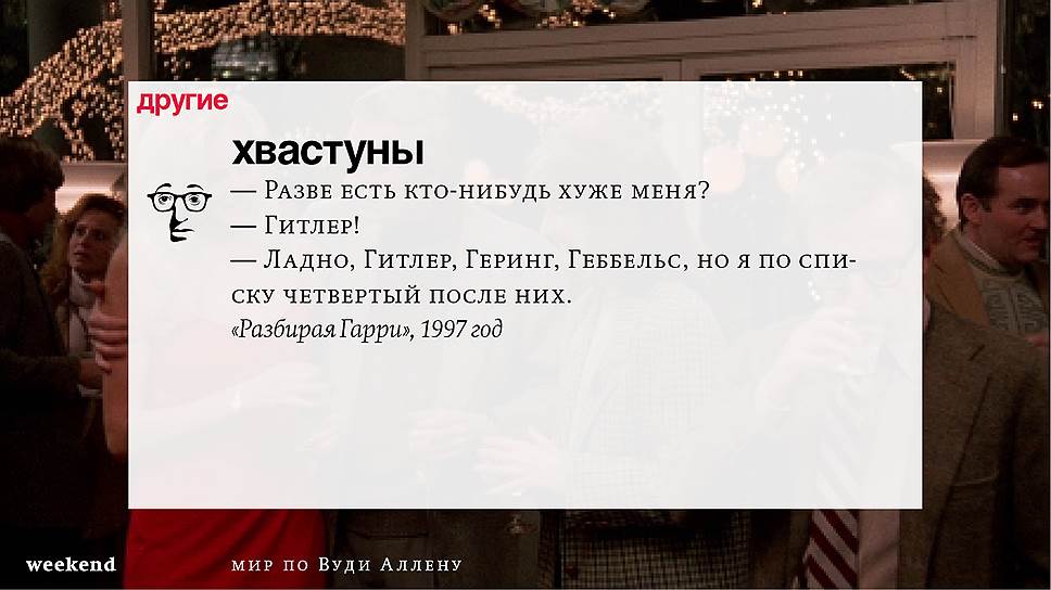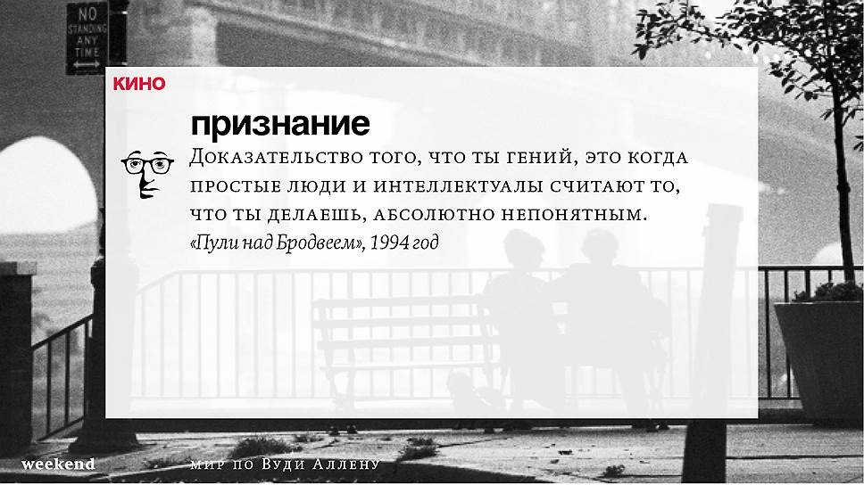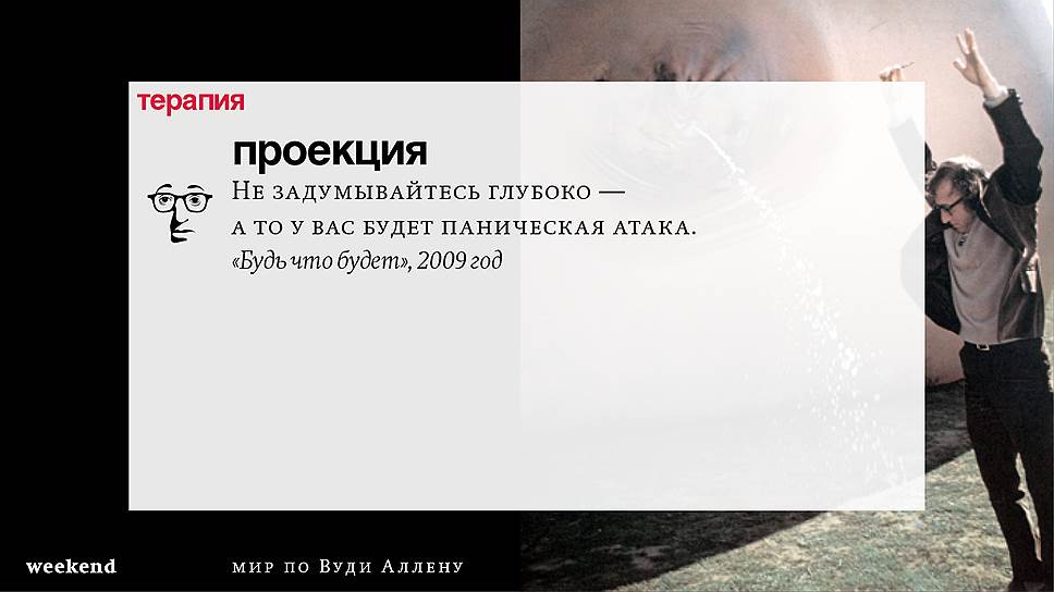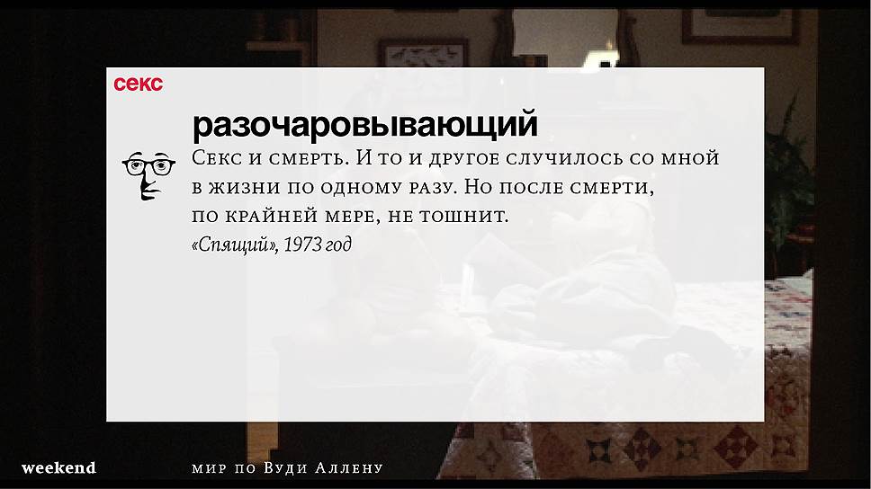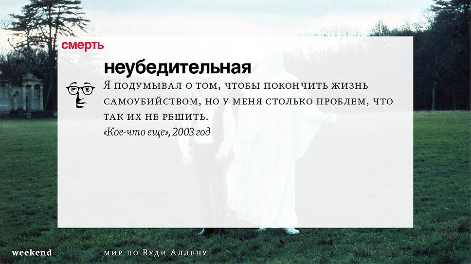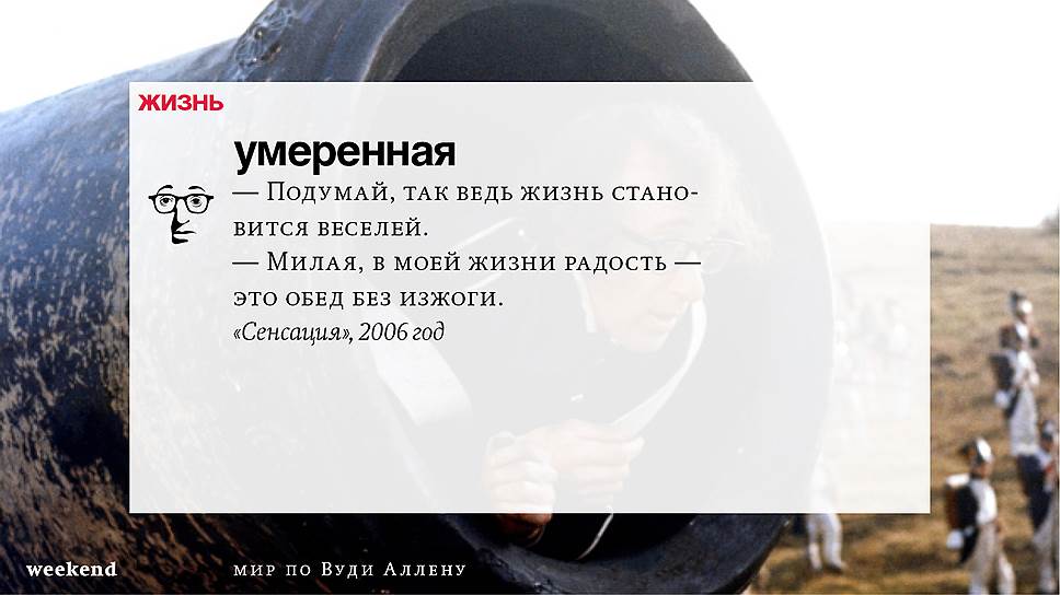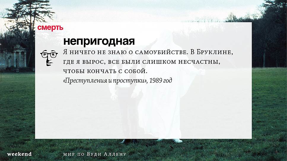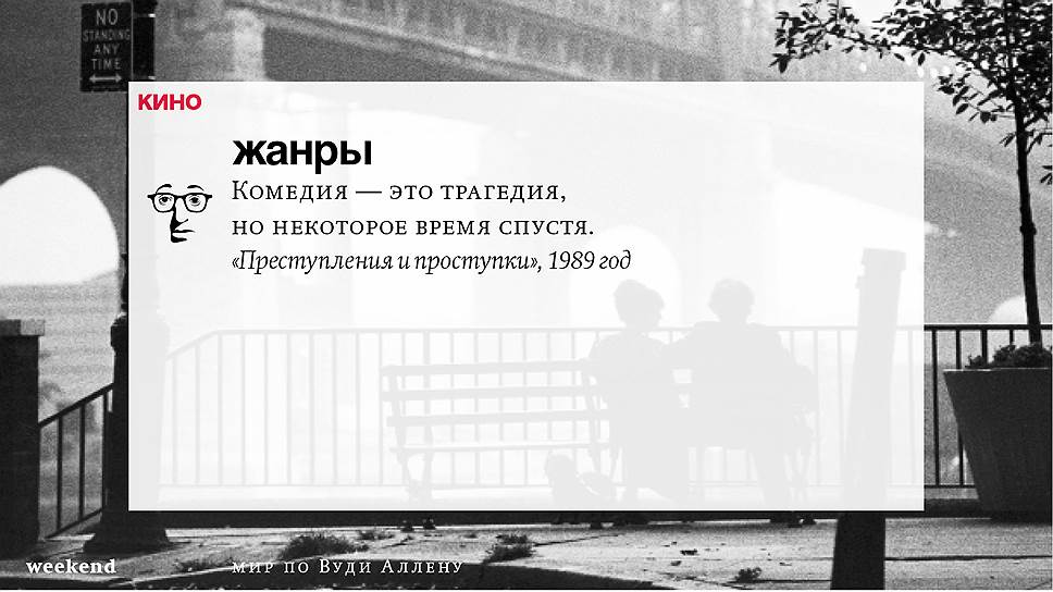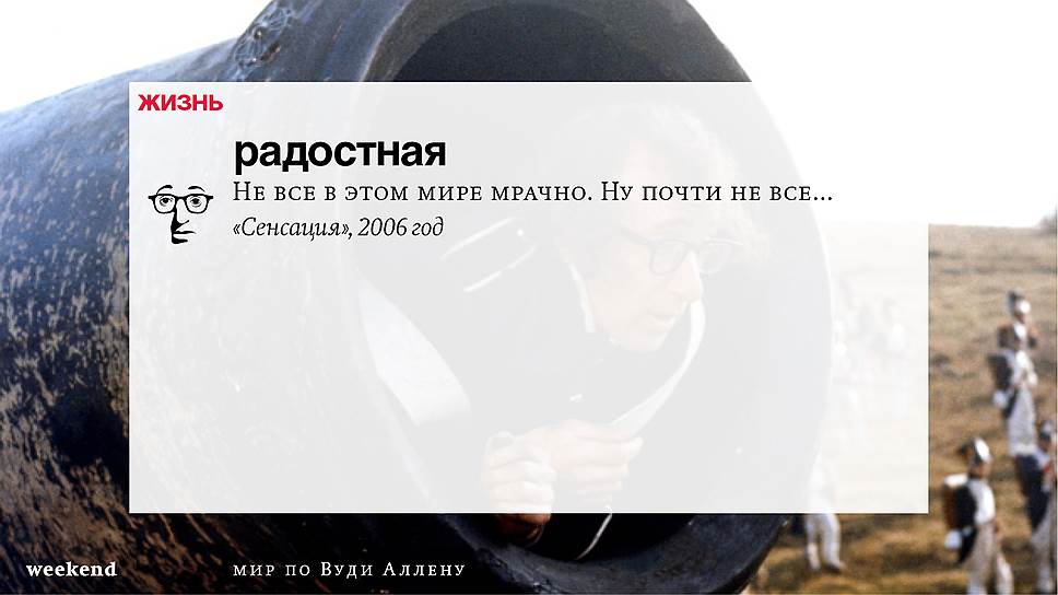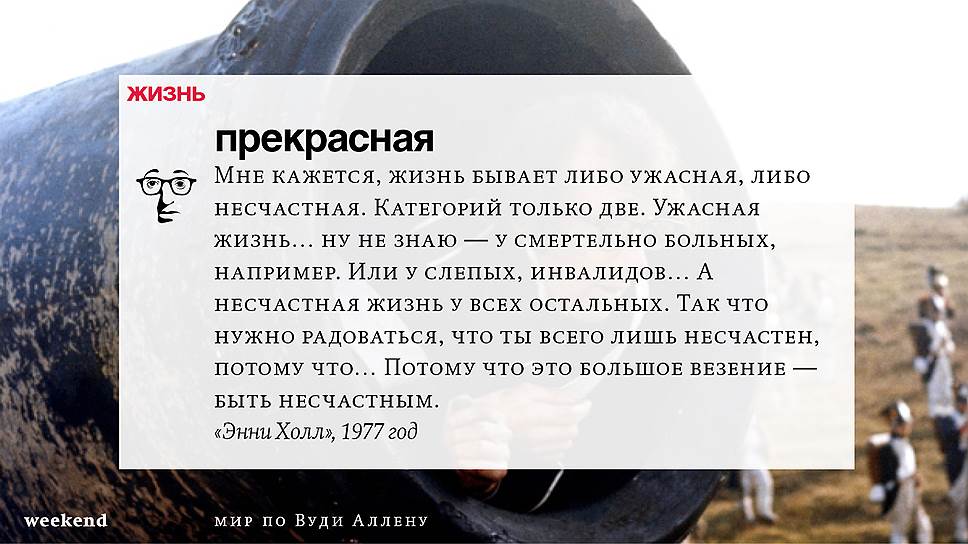 Главная идея этого кино, всего этого кинематографа, напрямую высказана в фильме "Разбирая Гарри". Главному герою (то есть самому Аллену), как обычно, ноющему, что несчастлив, дух умершего приятеля сообщает усвоенную в загробном мире абсолютную истину: "Быть живым — это и значит быть счастливым". За последние пятьдесят лет Вуди Аллен высказал это соображение бесчисленное количество раз на бесчисленное количество ладов. Самое удивительное, что мы с неизменной готовностью ждем продолжений.