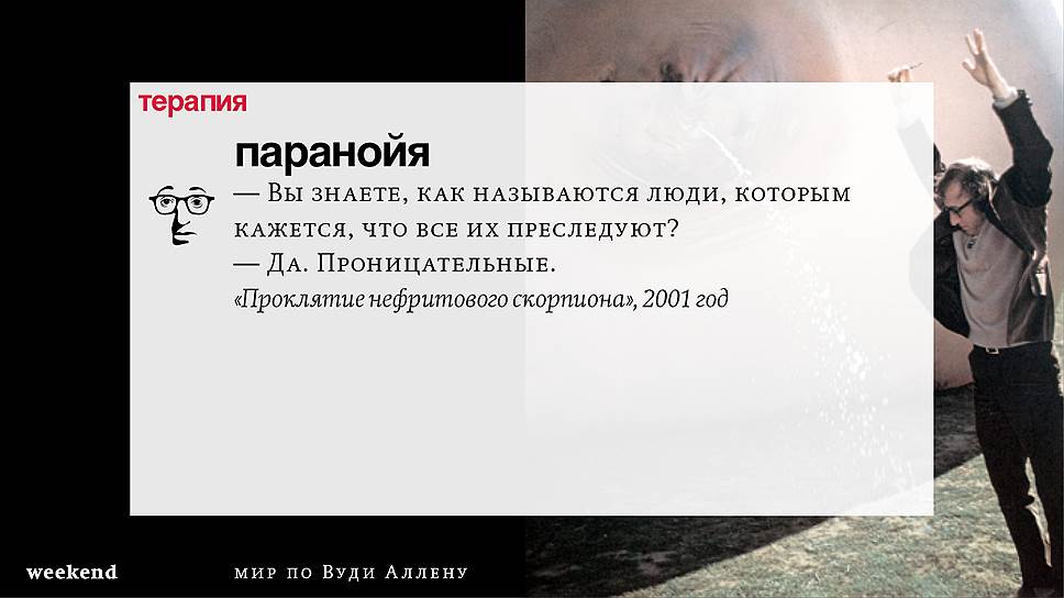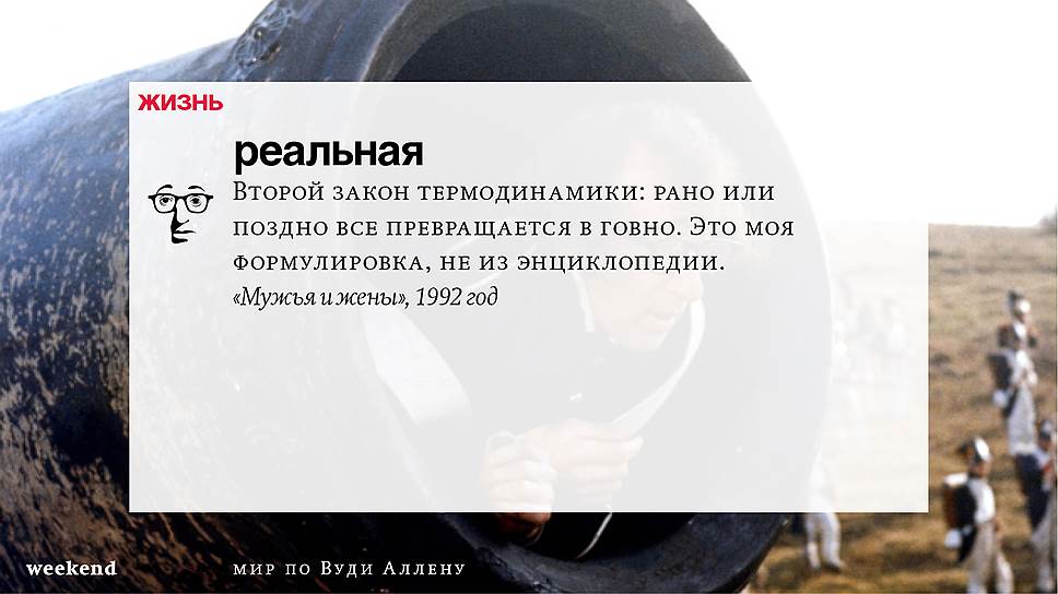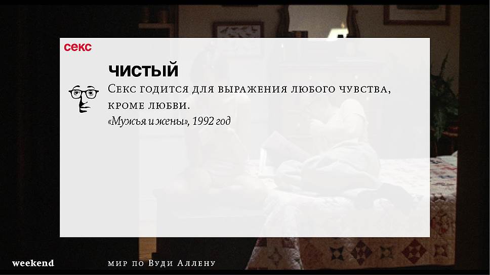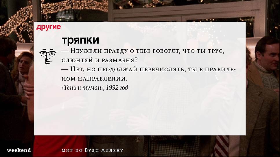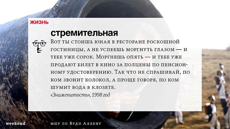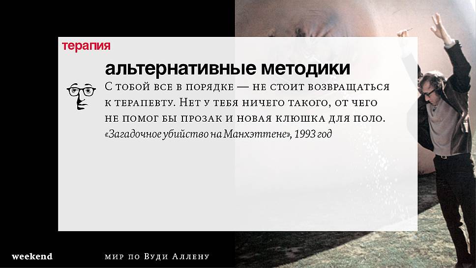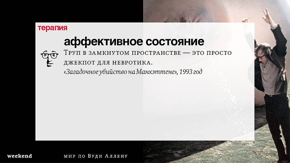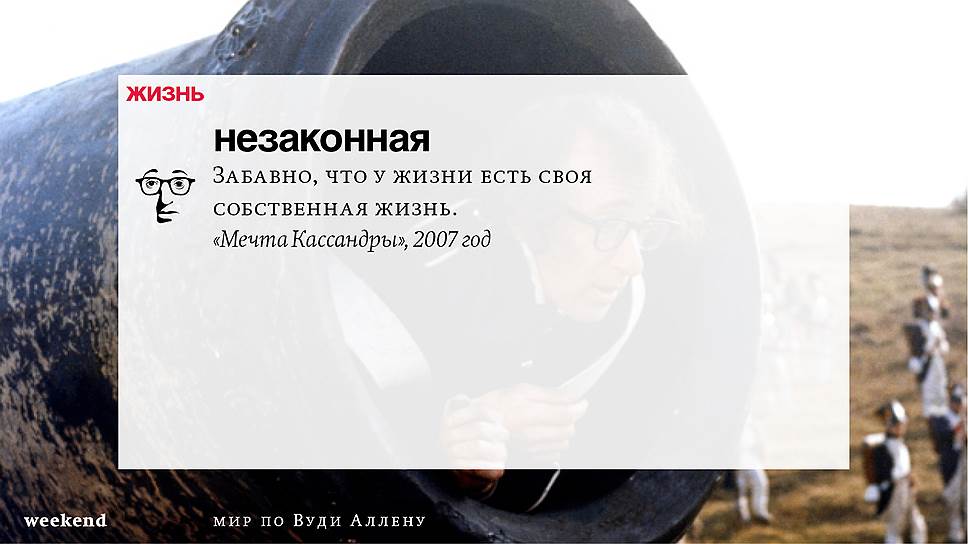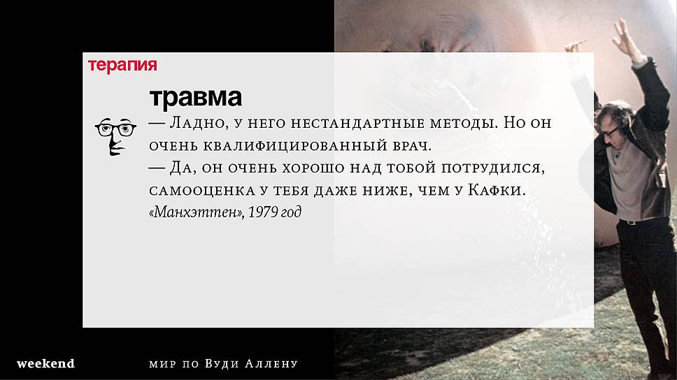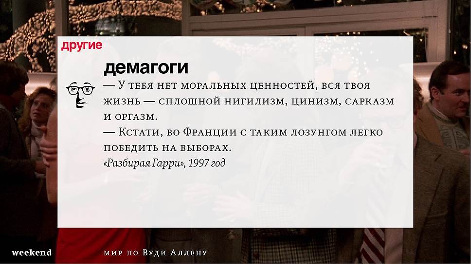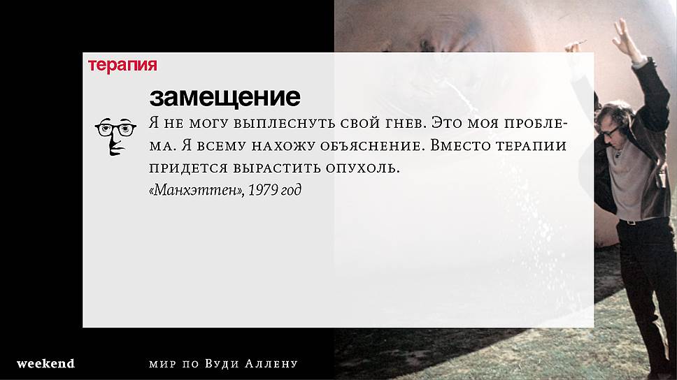 Главная идея этого кино, всего этого кинематографа, напрямую высказана в фильме "Разбирая Гарри". Главному герою (то есть самому Аллену), как обычно, ноющему, что несчастлив, дух умершего приятеля сообщает усвоенную в загробном мире абсолютную истину: "Быть живым — это и значит быть счастливым". За последние пятьдесят лет Вуди Аллен высказал это соображение бесчисленное количество раз на бесчисленное количество ладов. Самое удивительное, что мы с неизменной готовностью ждем продолжений.