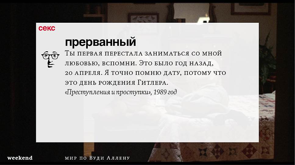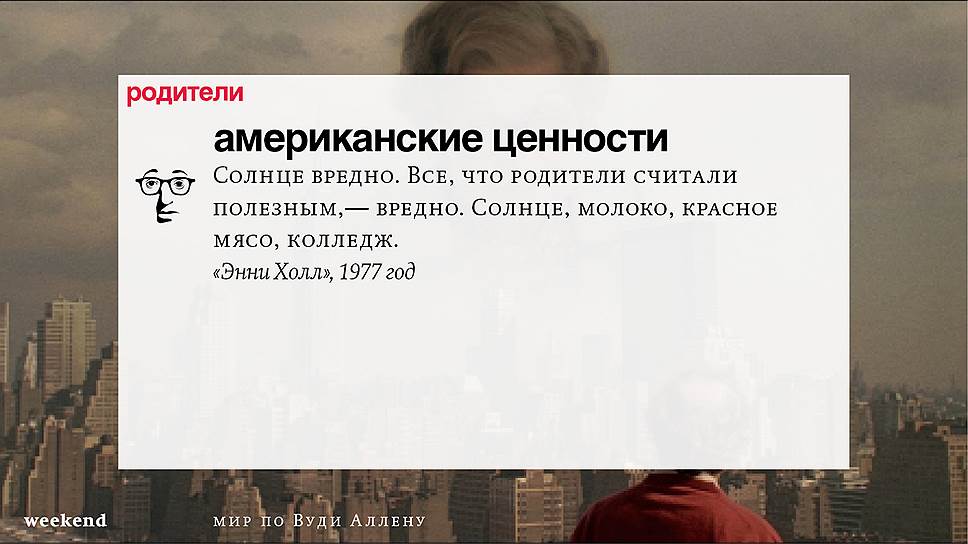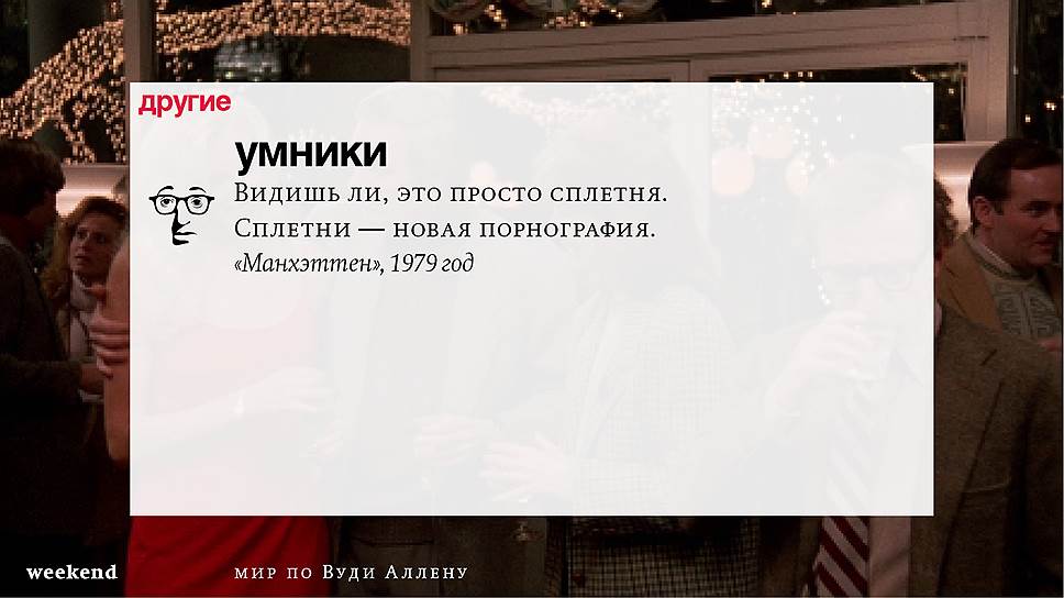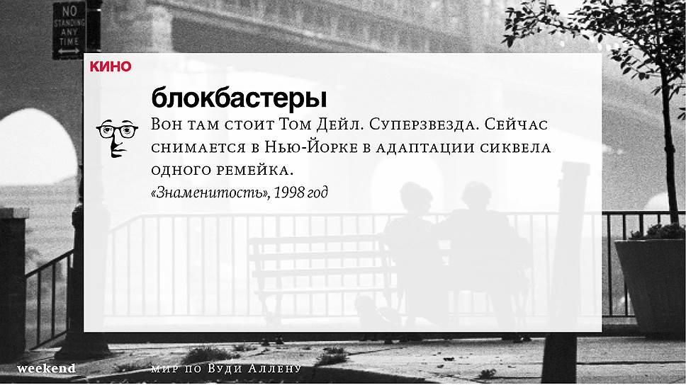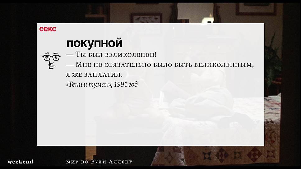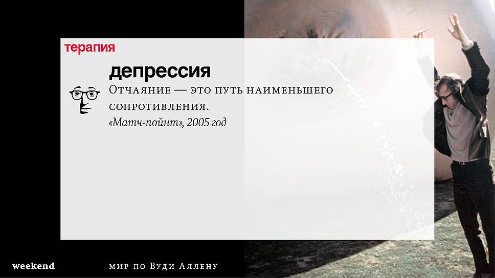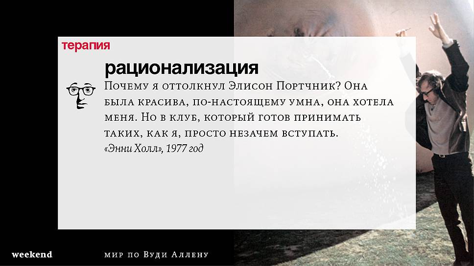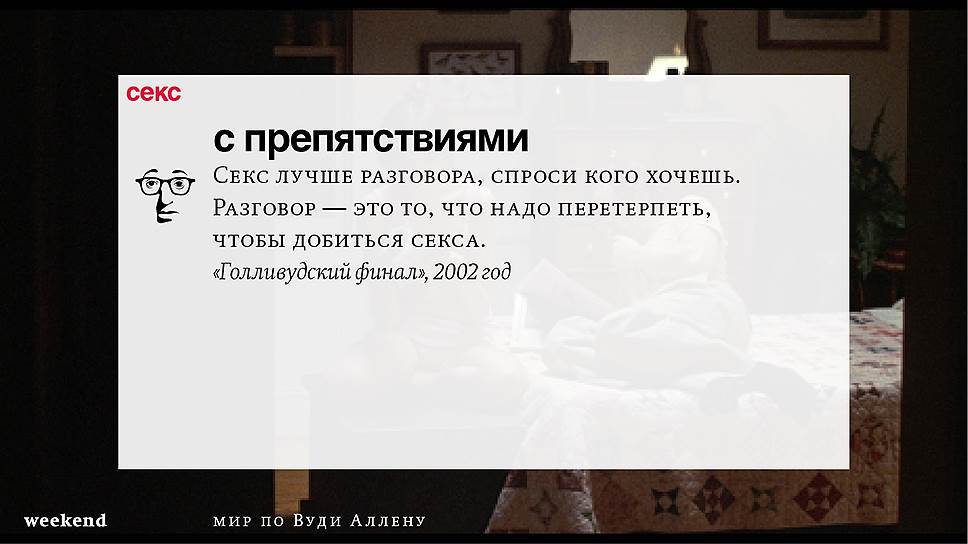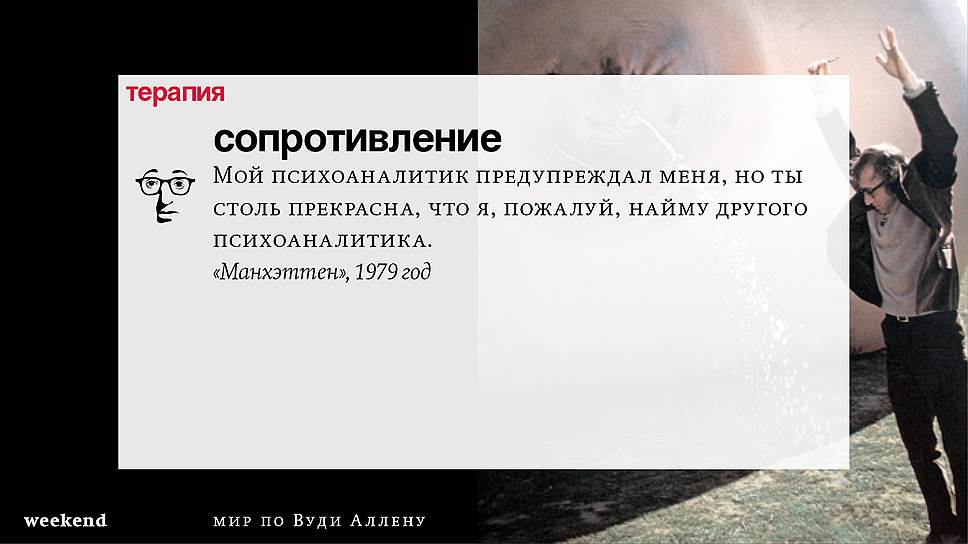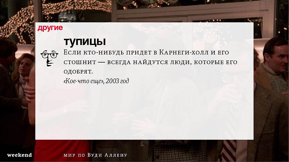 Главная идея этого кино, всего этого кинематографа, напрямую высказана в фильме "Разбирая Гарри". Главному герою (то есть самому Аллену), как обычно, ноющему, что несчастлив, дух умершего приятеля сообщает усвоенную в загробном мире абсолютную истину: "Быть живым — это и значит быть счастливым". За последние пятьдесят лет Вуди Аллен высказал это соображение бесчисленное количество раз на бесчисленное количество ладов. Самое удивительное, что мы с неизменной готовностью ждем продолжений.