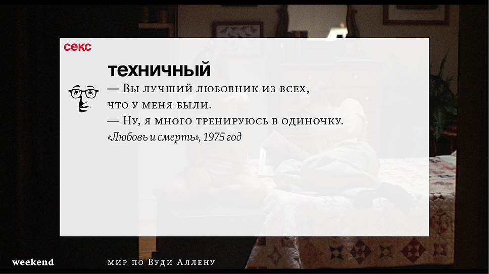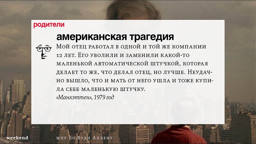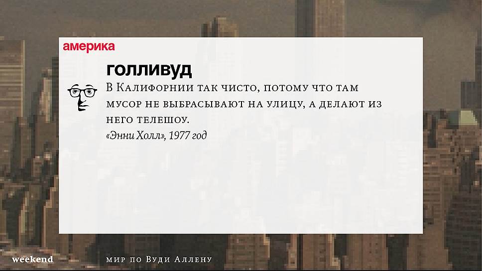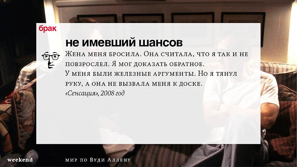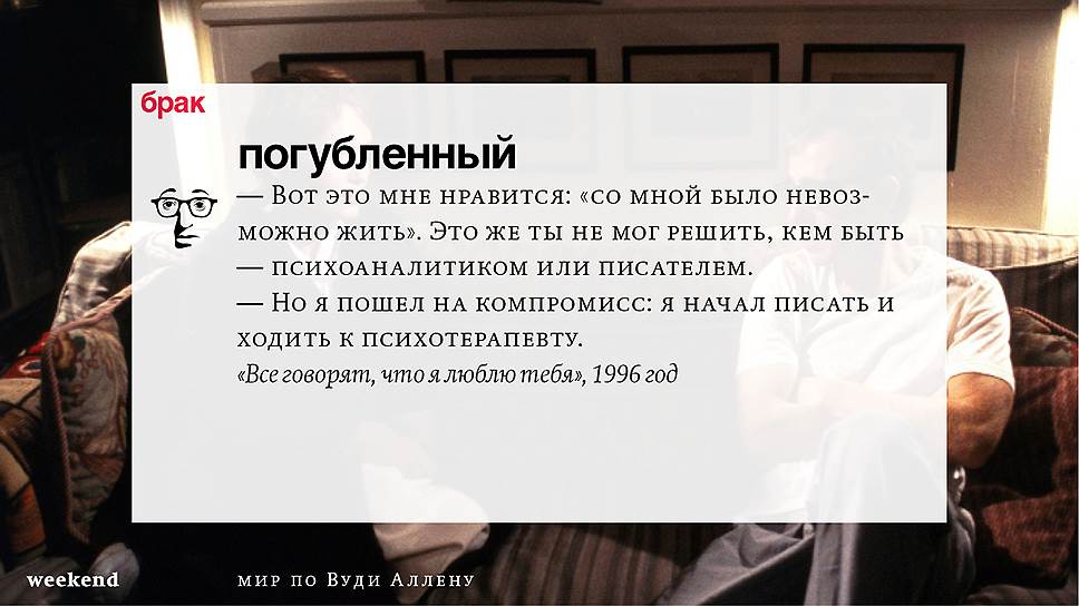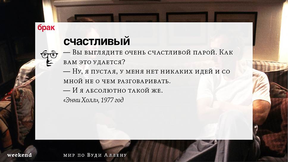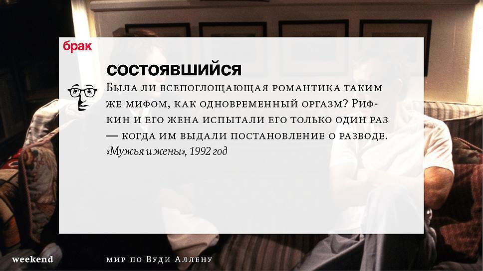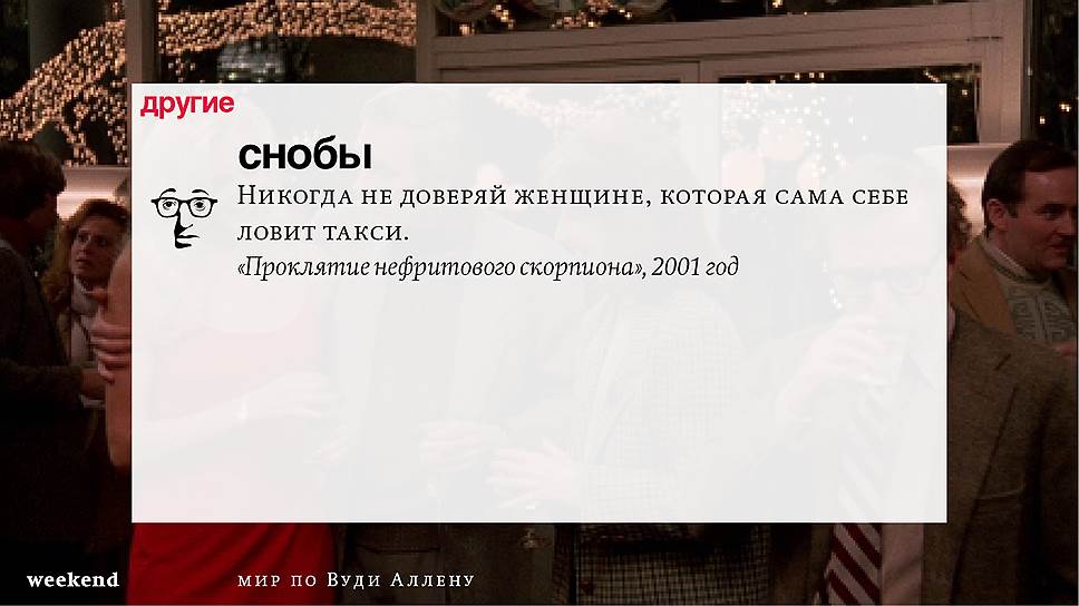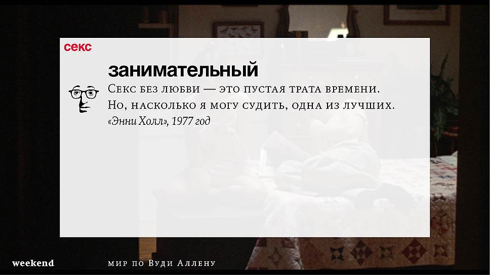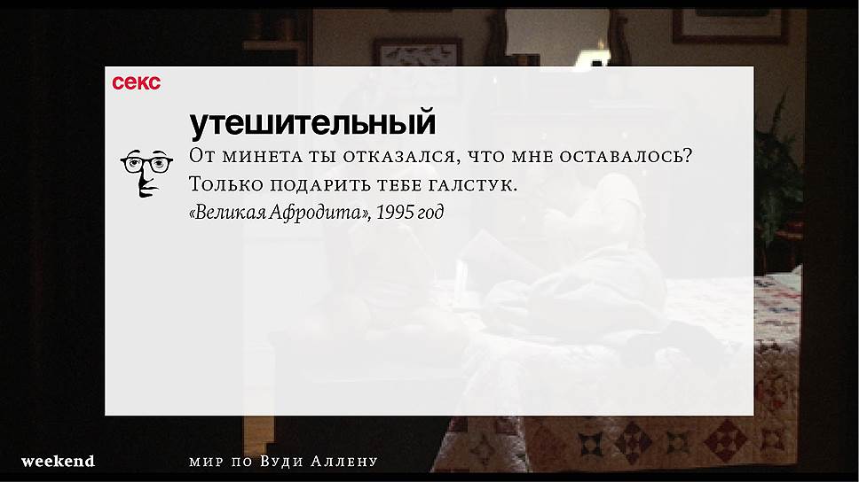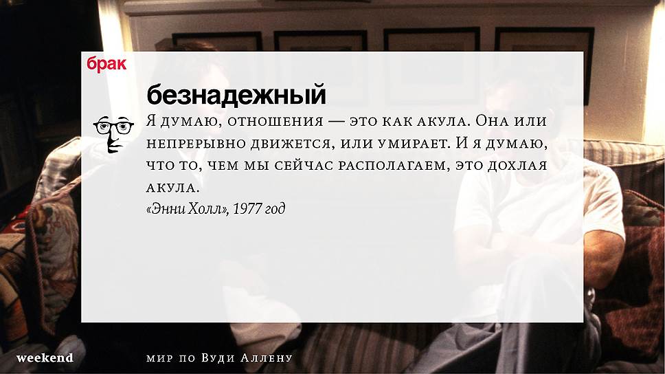Главная идея этого кино, всего этого кинематографа, напрямую высказана в фильме "Разбирая Гарри". Главному герою (то есть самому Аллену), как обычно, ноющему, что несчастлив, дух умершего приятеля сообщает усвоенную в загробном мире абсолютную истину: "Быть живым — это и значит быть счастливым". За последние пятьдесят лет Вуди Аллен высказал это соображение бесчисленное количество раз на бесчисленное количество ладов. Самое удивительное, что мы с неизменной готовностью ждем продолжений.