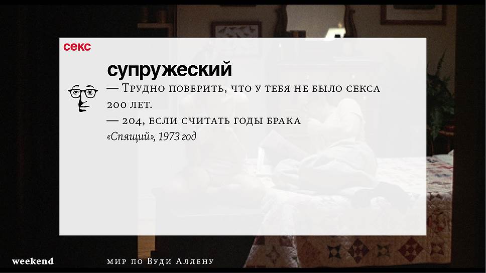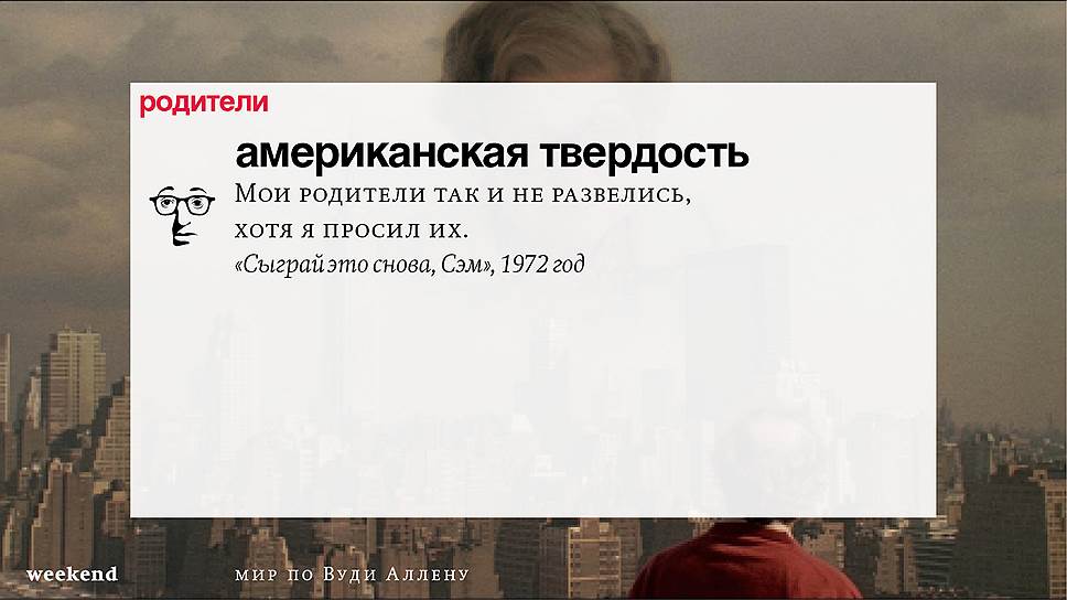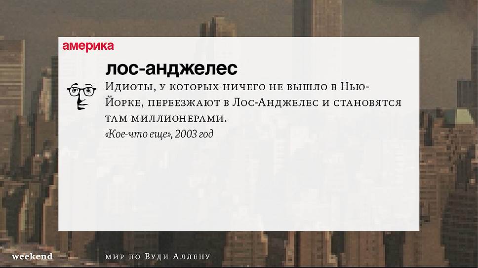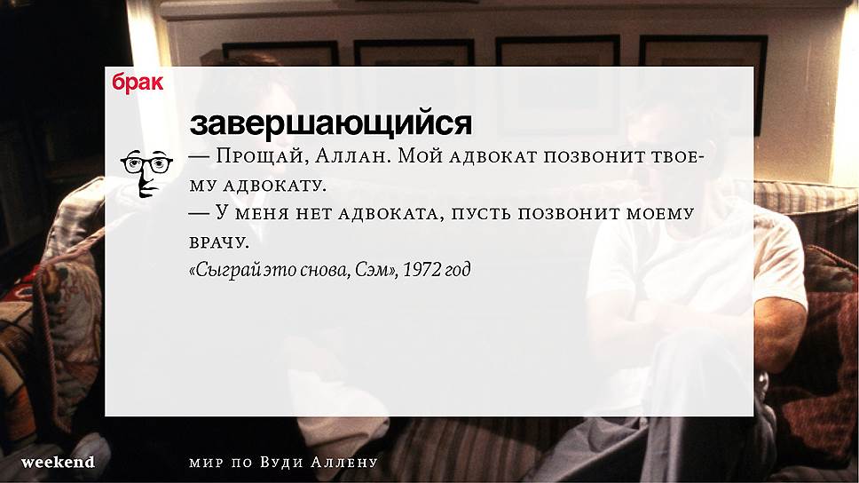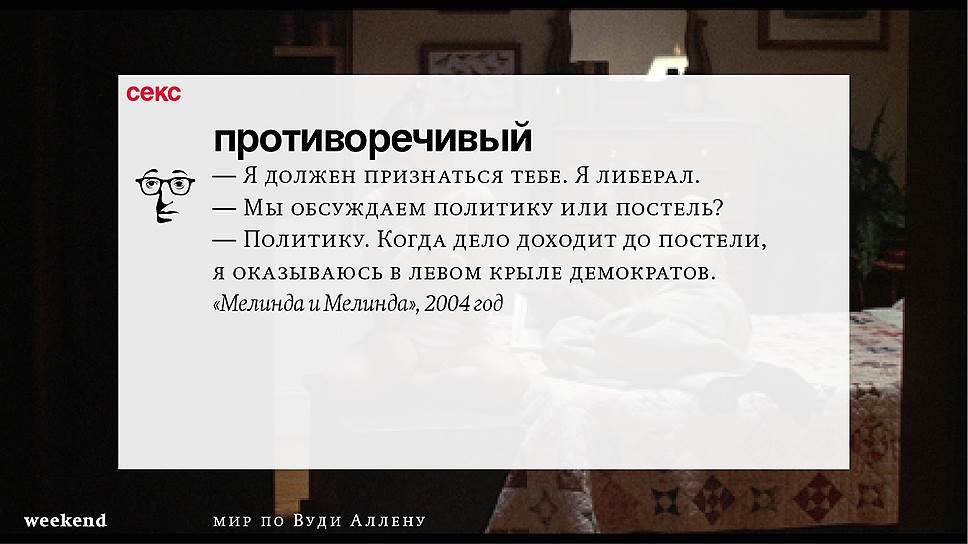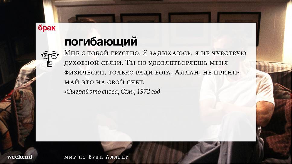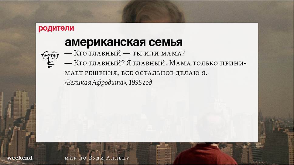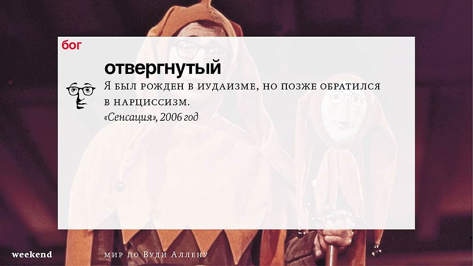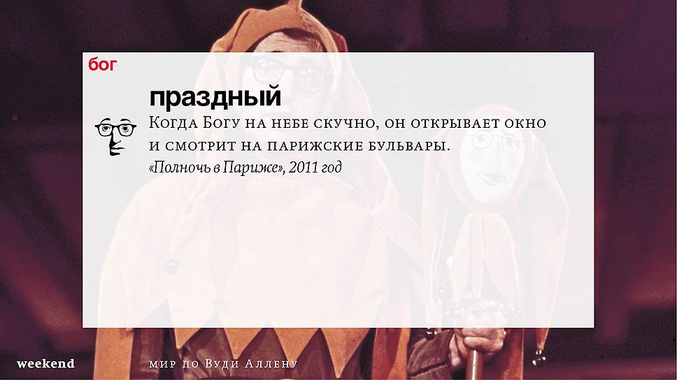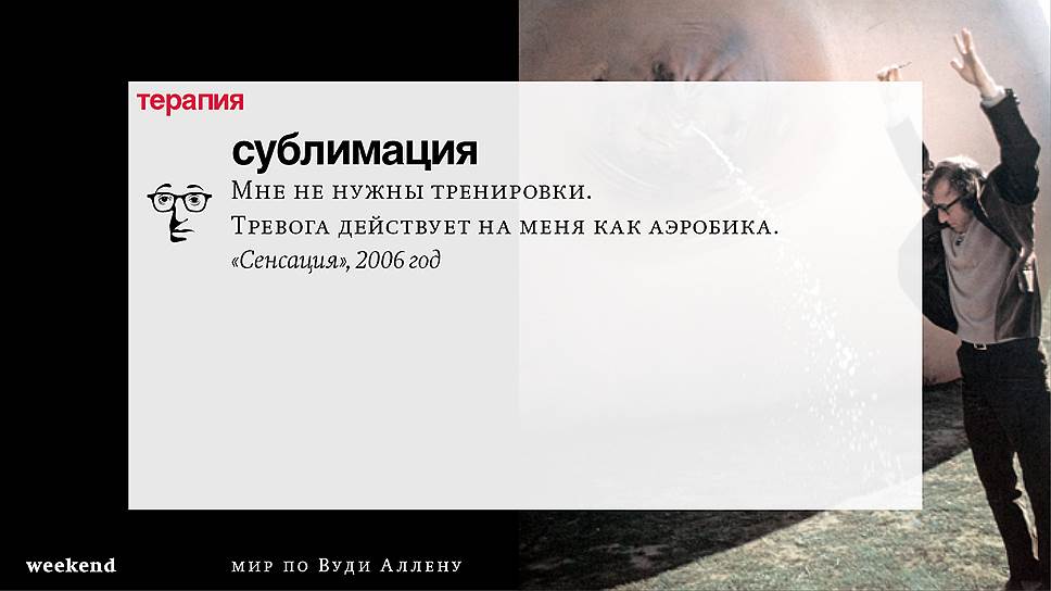Главная идея этого кино, всего этого кинематографа, напрямую высказана в фильме "Разбирая Гарри". Главному герою (то есть самому Аллену), как обычно, ноющему, что несчастлив, дух умершего приятеля сообщает усвоенную в загробном мире абсолютную истину: "Быть живым — это и значит быть счастливым". За последние пятьдесят лет Вуди Аллен высказал это соображение бесчисленное количество раз на бесчисленное количество ладов. Самое удивительное, что мы с неизменной готовностью ждем продолжений.