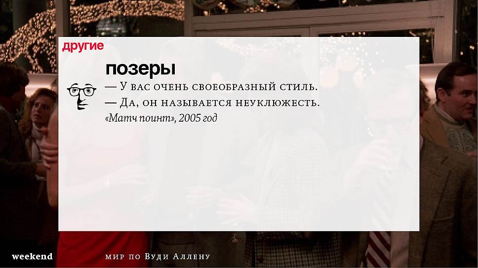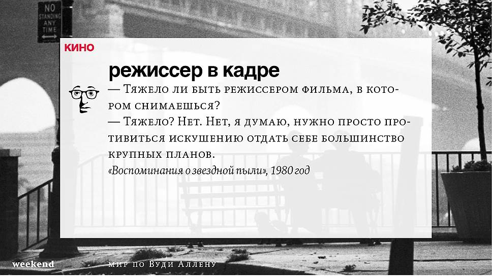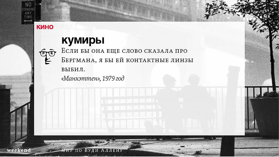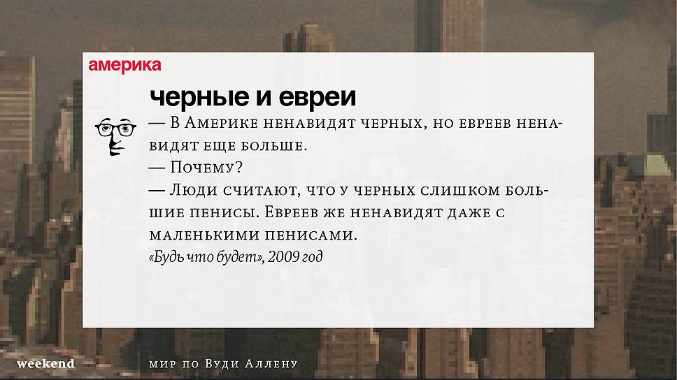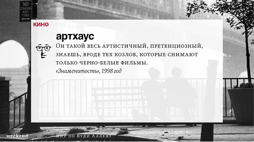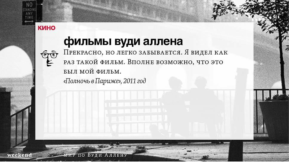 С тех пор он снял множество фильмов (среди которых несколько абсолютно прочно вошедших в списки киноклассики) и с невероятной тщательностью проработал свою территорию, занятую нью-йоркскими интеллектуалами и просто рефлексирующими евреями, их точно знающими как жить престарелыми родителями и недостижимыми, вечно ускользающими гойками. При этом в мире Аллена всегда возможны изменения и вариации — местом действия может оказаться не Нью-Йорк, а Барселона или Париж, временем — совсем не современность, главным героем — высокий блондин, в фильме даже может не случиться никаких шуток, но это всегда несомненно будет "кино Вуди Аллена".